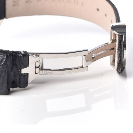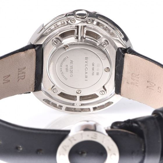 Watch is crafted of an 18 white gold case and buckle. Features also include a 36mm round case that is accented with diamonds, a white dial, and a Swiss quartz movement.