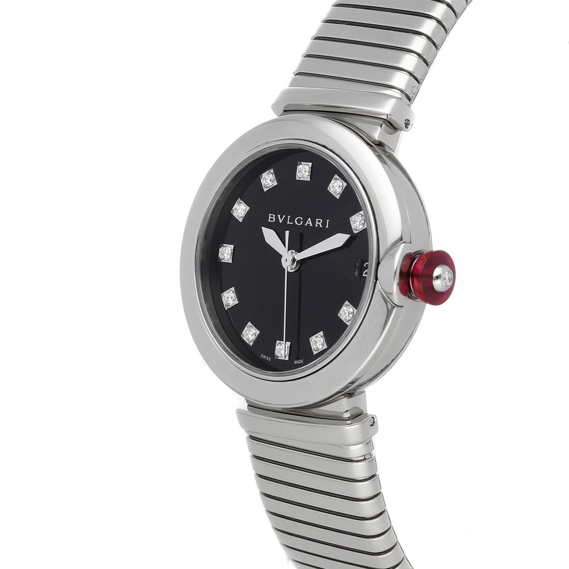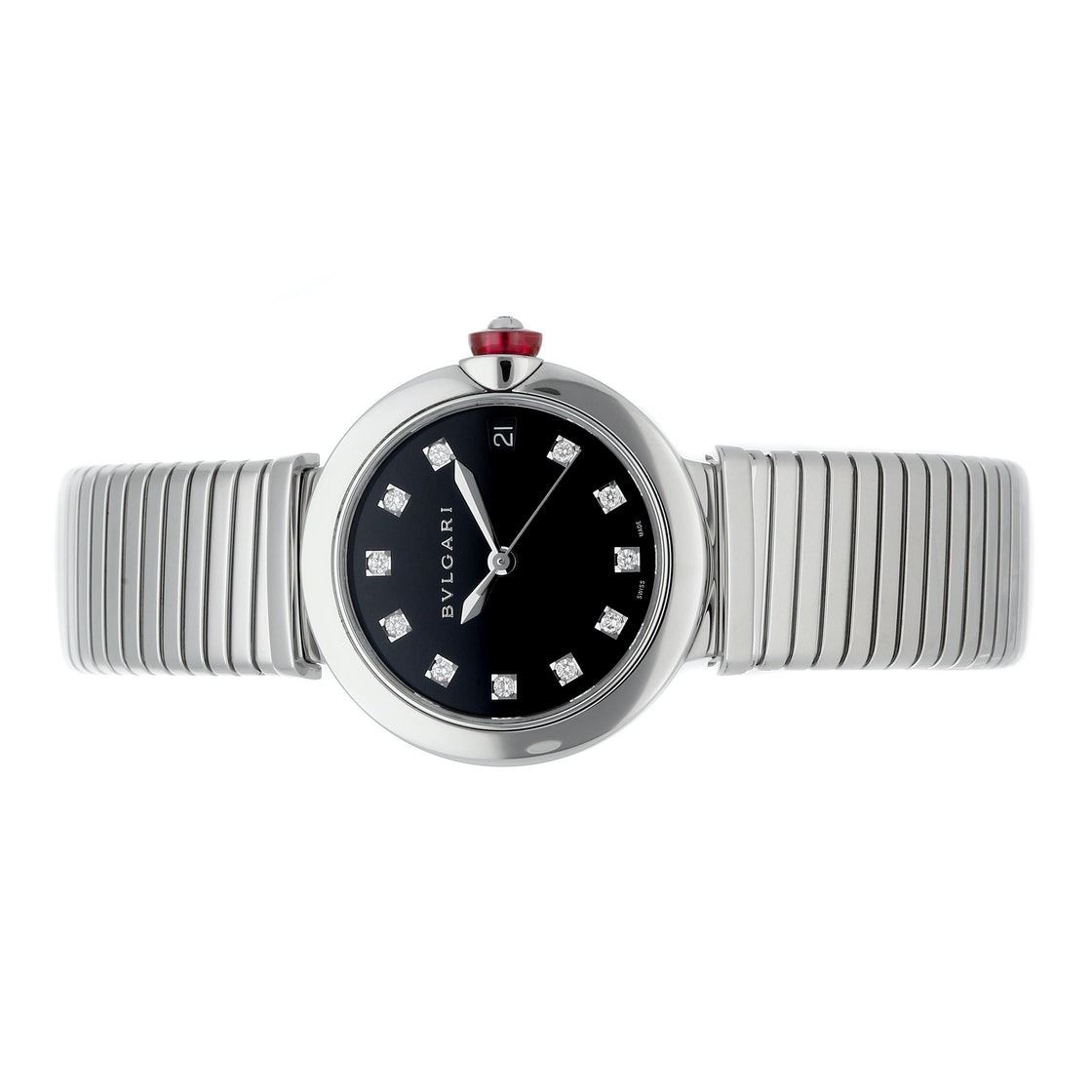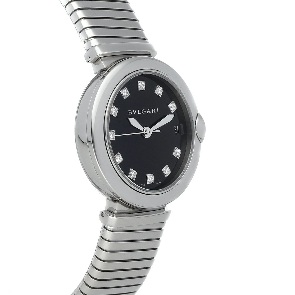 Bulgari Lvcea Tubogas (102953) self-winding automatic watch, features a 33mm stainless steel case surrounding a black diamond dial on a stainless steel bracelet with folding buckle.