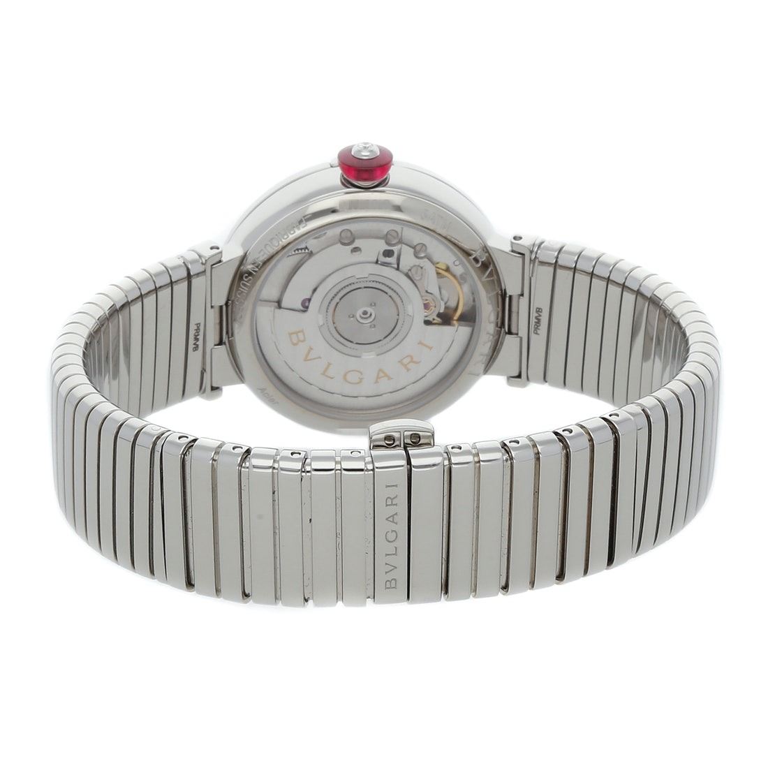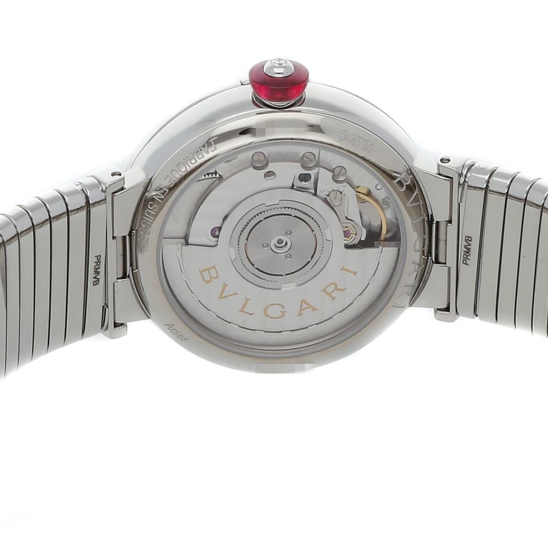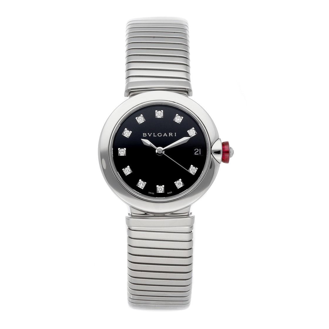 Bulgari Lvcea Tubogas (102953) self-winding automatic watch, features a 33mm stainless steel case surrounding a black diamond dial on a stainless steel bracelet with folding buckle.