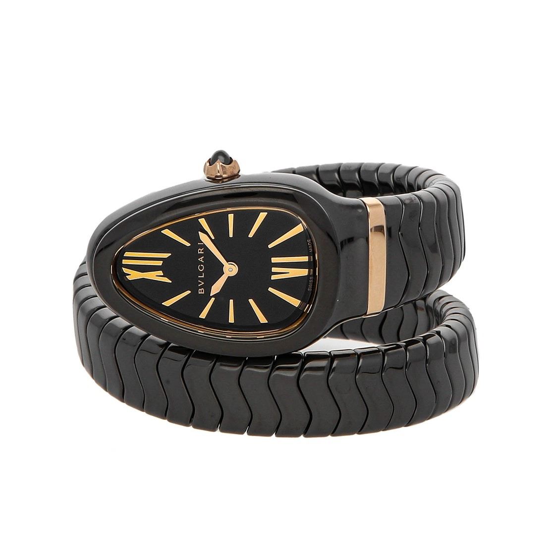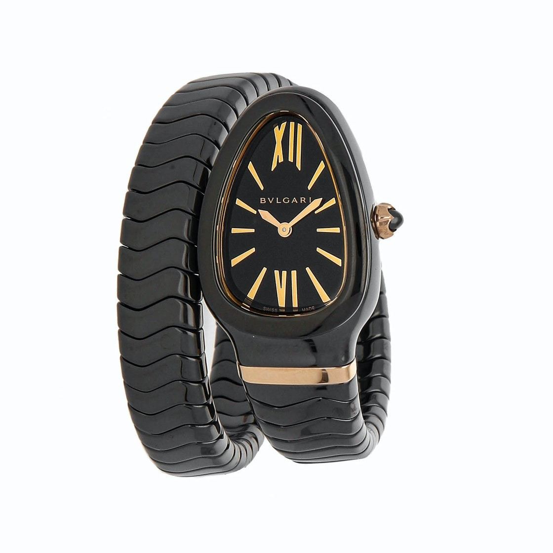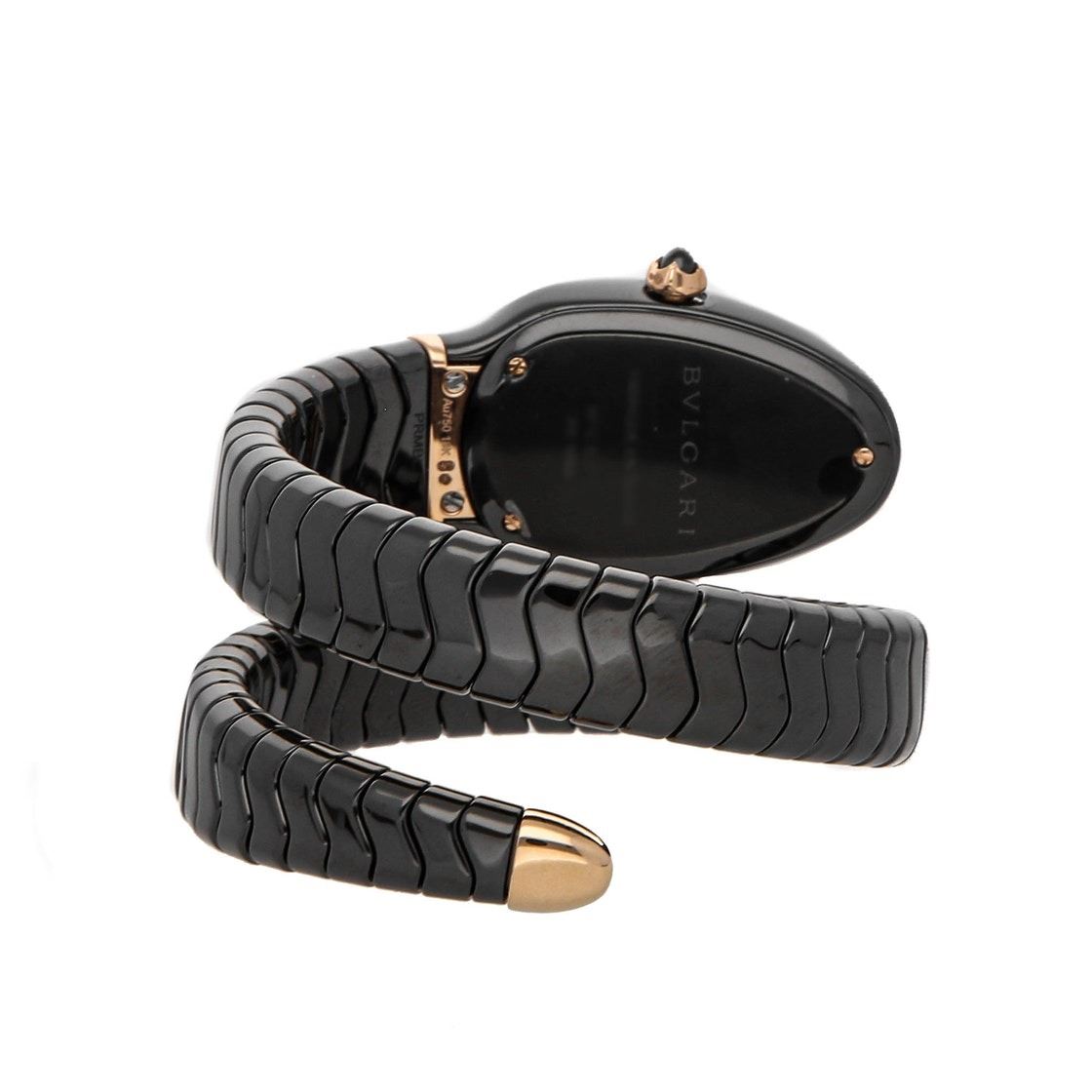 Pre-Owned Bulgari Serpenti Spiga (102734) quartz watch, features a 35mm black ceramic case with an 18k rose gold bezel surrounding a black dial on an 18k rose gold and black ceramic 1 turn bracelet. Functions include hours and minutes.