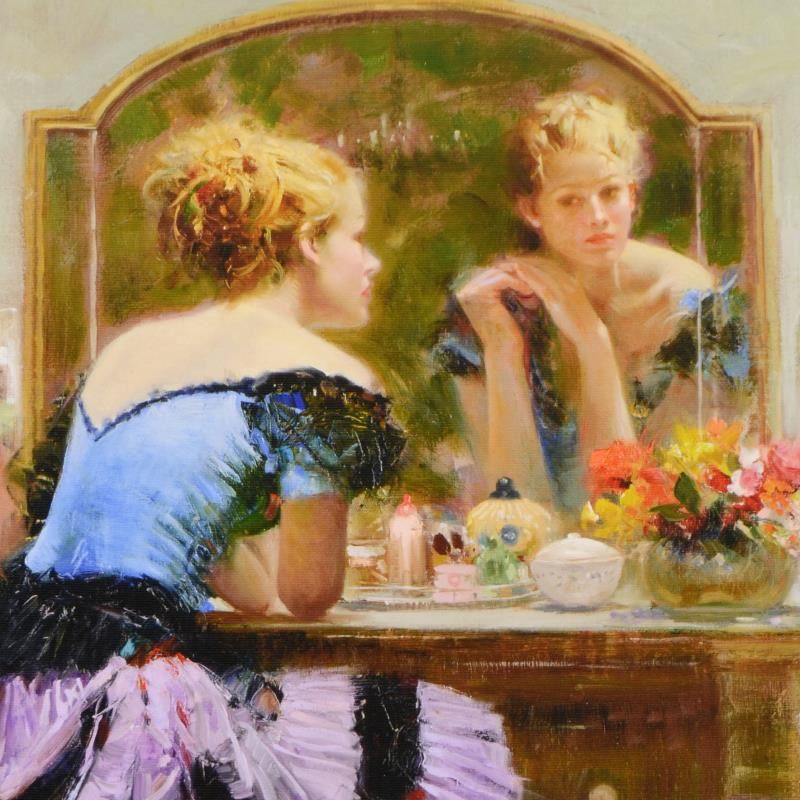"By the Mirror" is a limited edition giclee on canvas by Pino (1939-2010), numbered and hand signed by the artist. Includes Certificate of Authenticity. Measures approx. 14" x 18" (image).