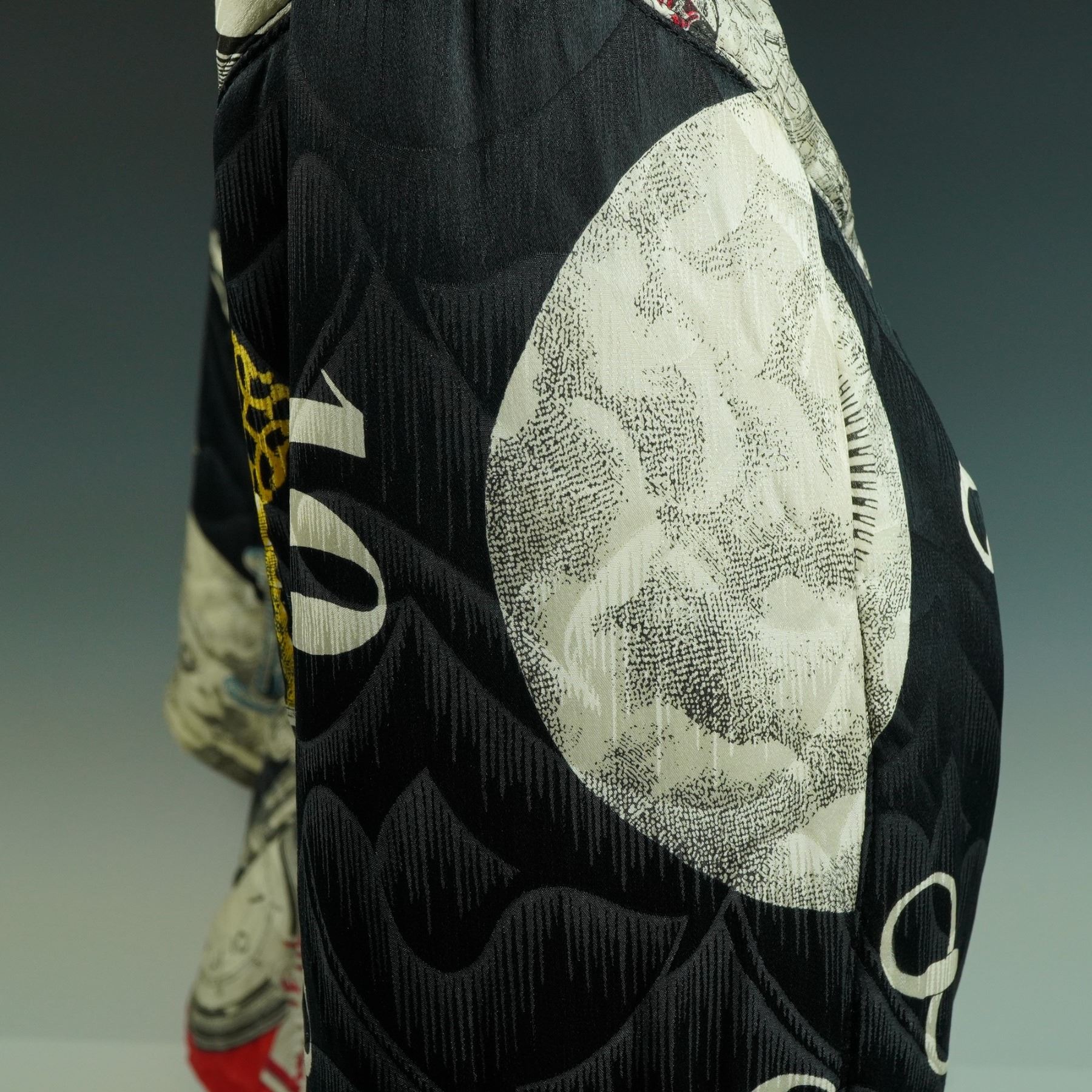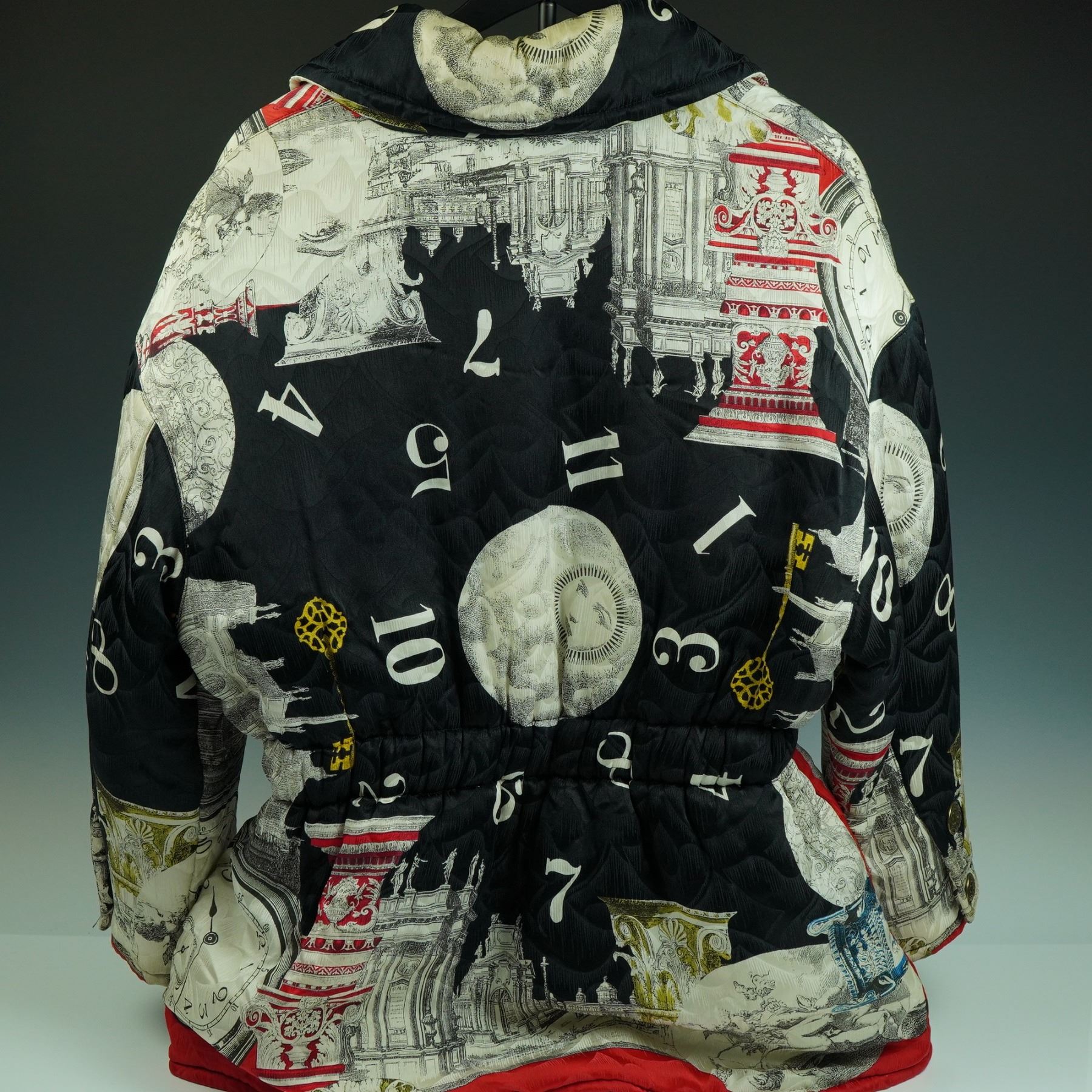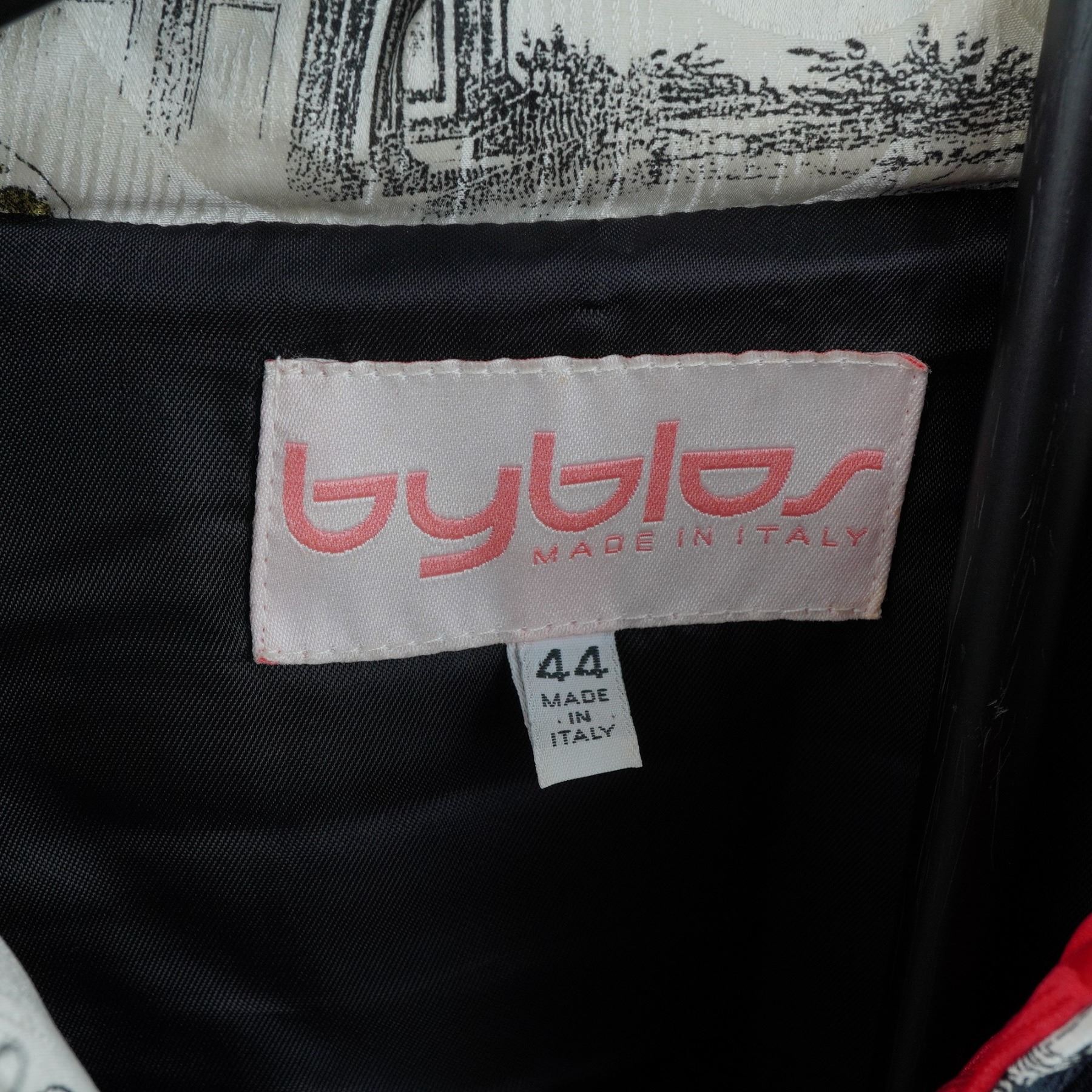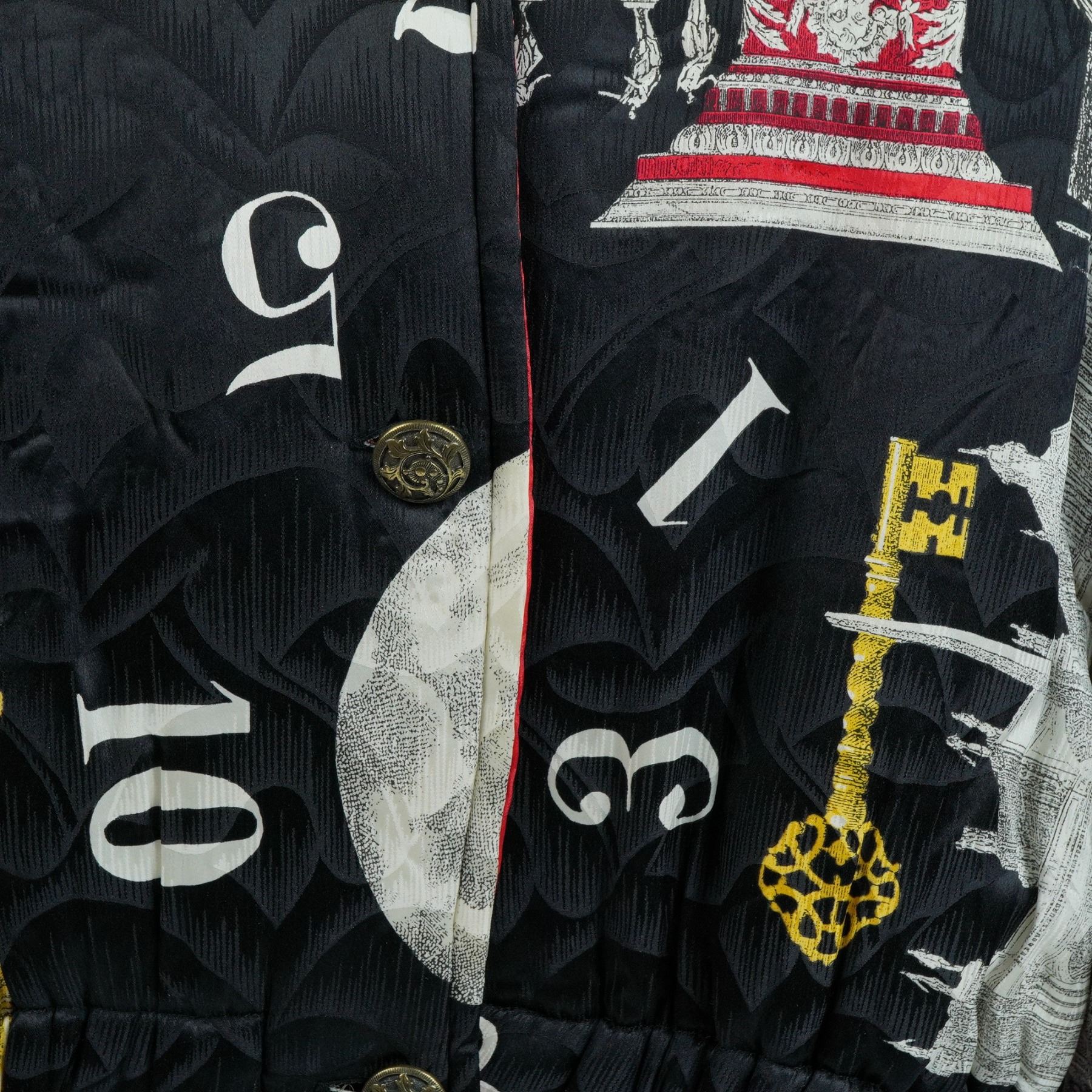 Italian-made Byblos jacket featuring a dynamic all-over print of classical architecture, antique clock faces, Roman numerals, and golden keys rendered in bold, theatrical contrast. The black quilted ground provides depth and texture, accentuating the white, red, and yellow imagery in a baroque-graphic collage style. Designed with a tailored fit, button front closure with decorative metal buttons, structured collar, and gathered waistline to enhance silhouette. Interior label marked "Byblos Made in Italy". A collector's fashion statement from a brand known for its avant-garde innovation in the 1980s and 1990s Milan scene. Size 44.