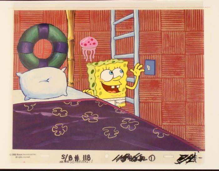 To create production cels, the original animator's drawing is transferred onto an acetate cel (by hand-inking and/or photo copying). The cel is then hand-painted on the reverse side. The background accompanying this set-up is a hand-painted original production background. The background is ready to be matted and framed. It is a colored background with a cel and has the animator's notations at the bottom of both. The cel is multilayerd: first is the rope, next is the jellyfish, and then Spongebob.