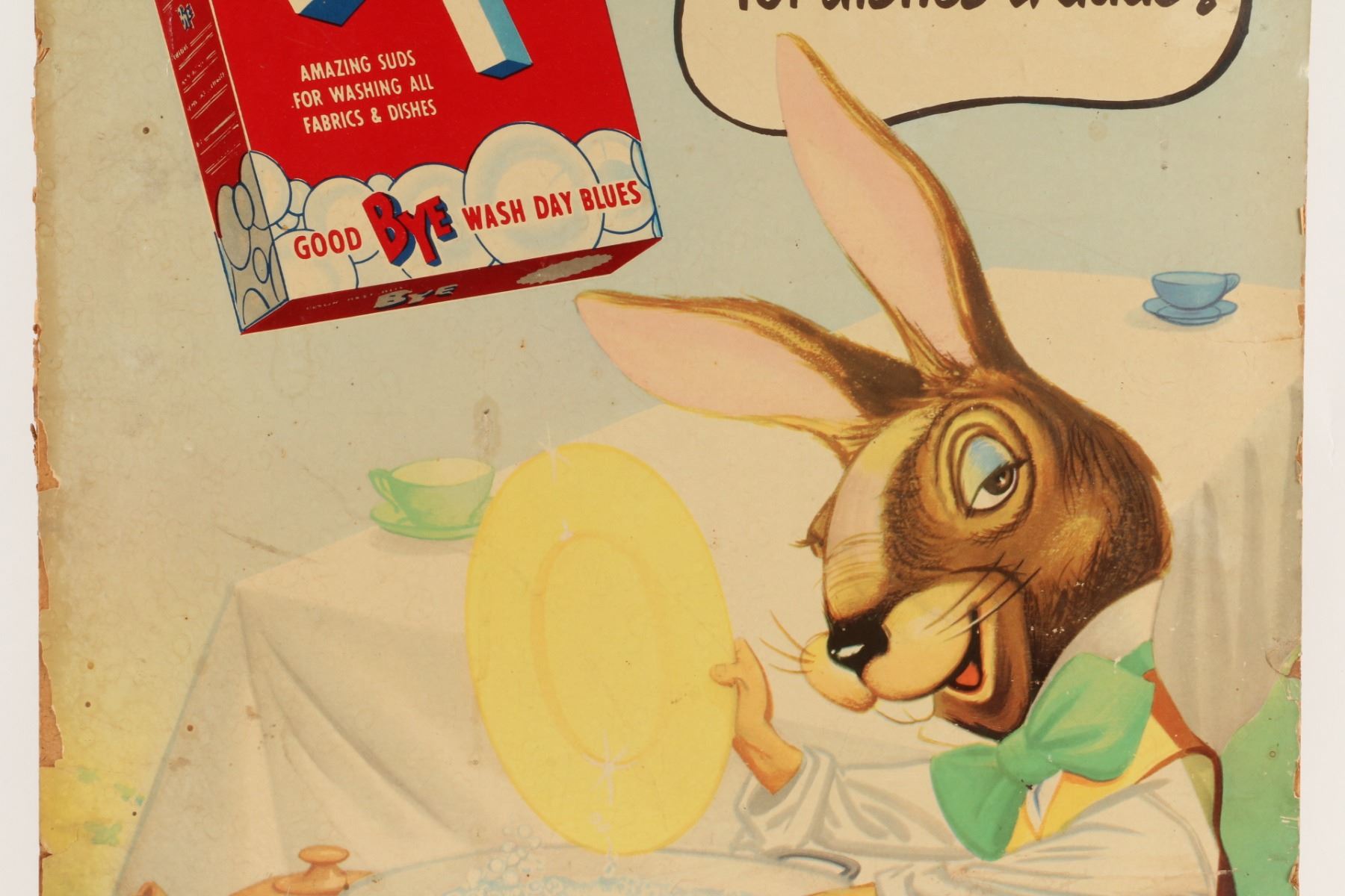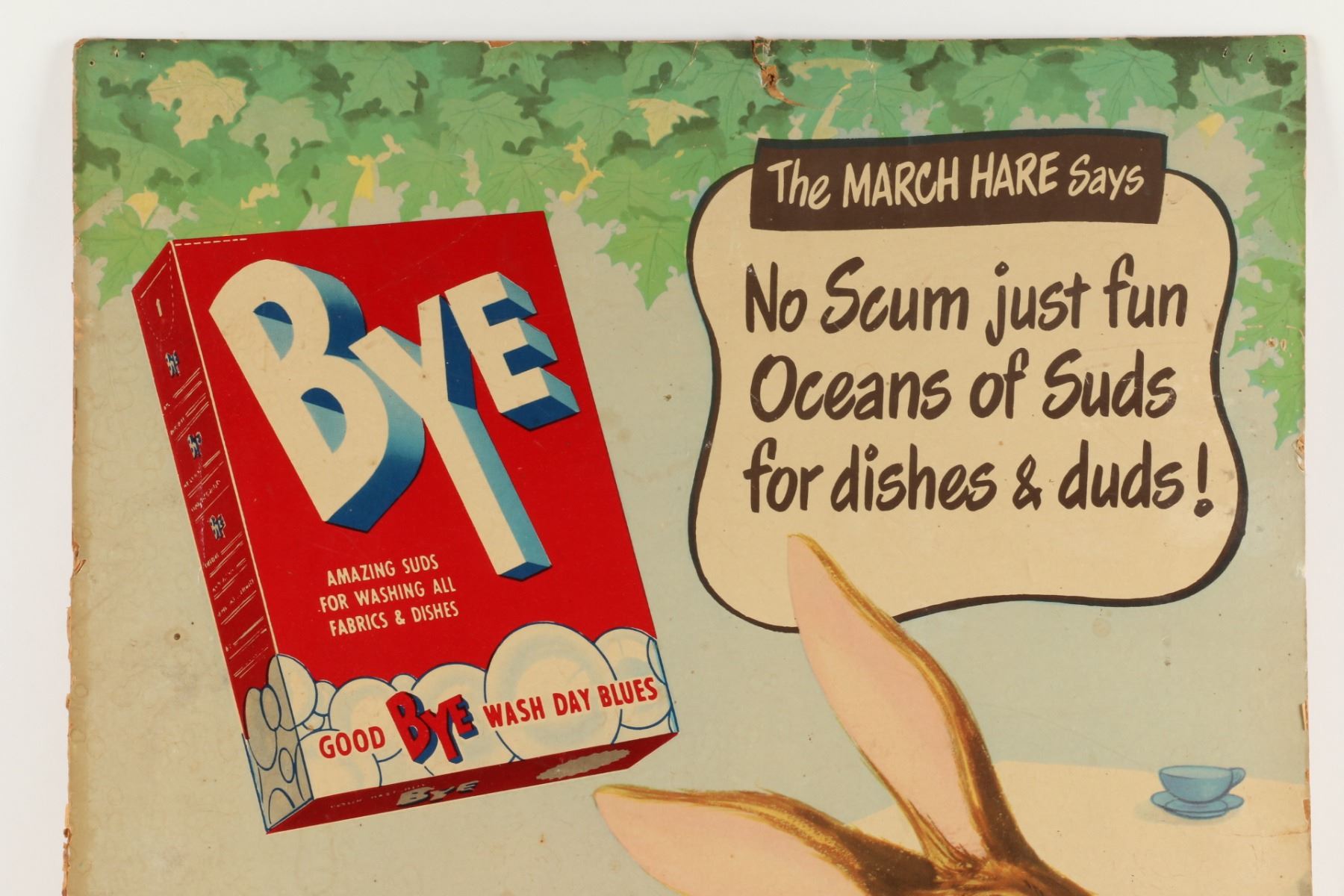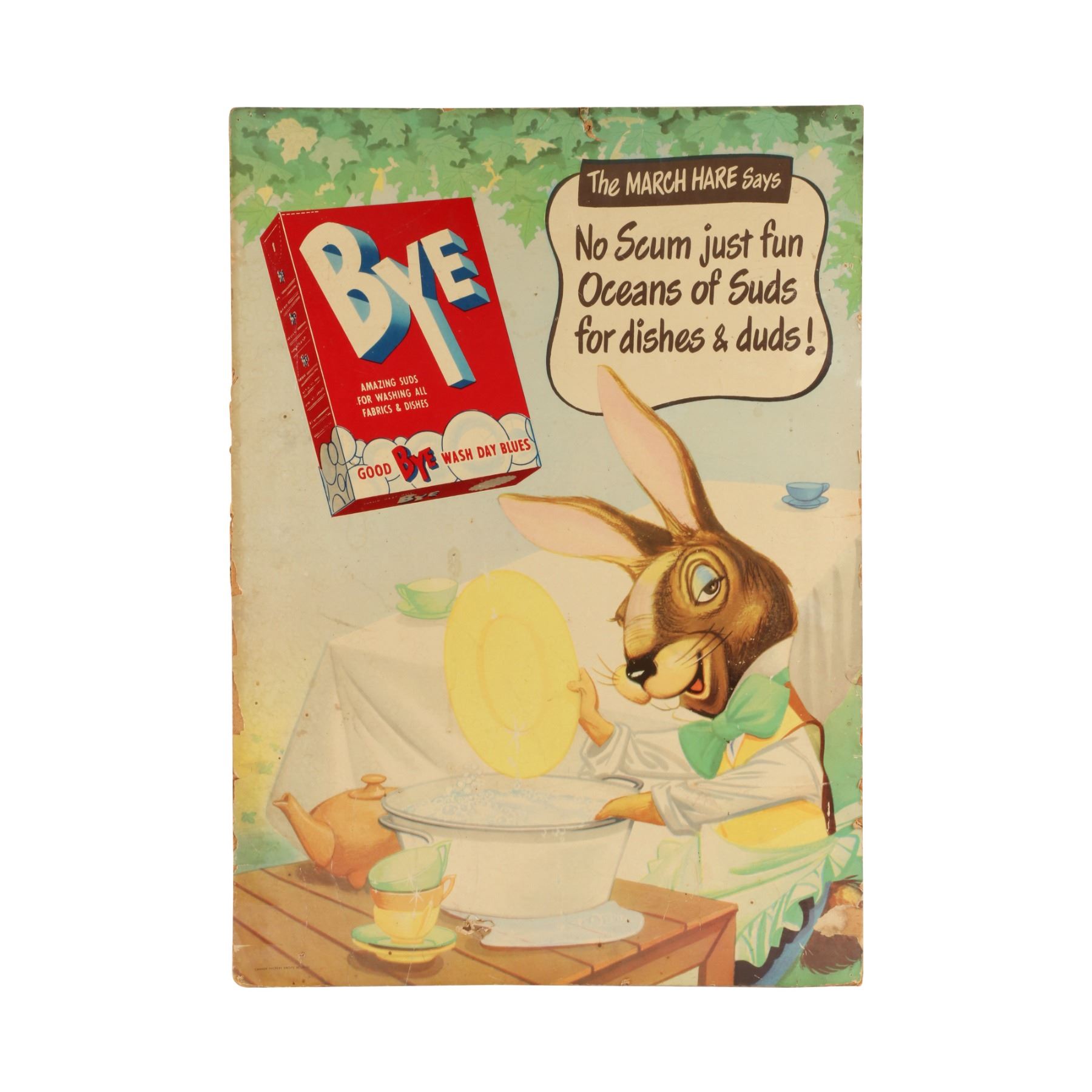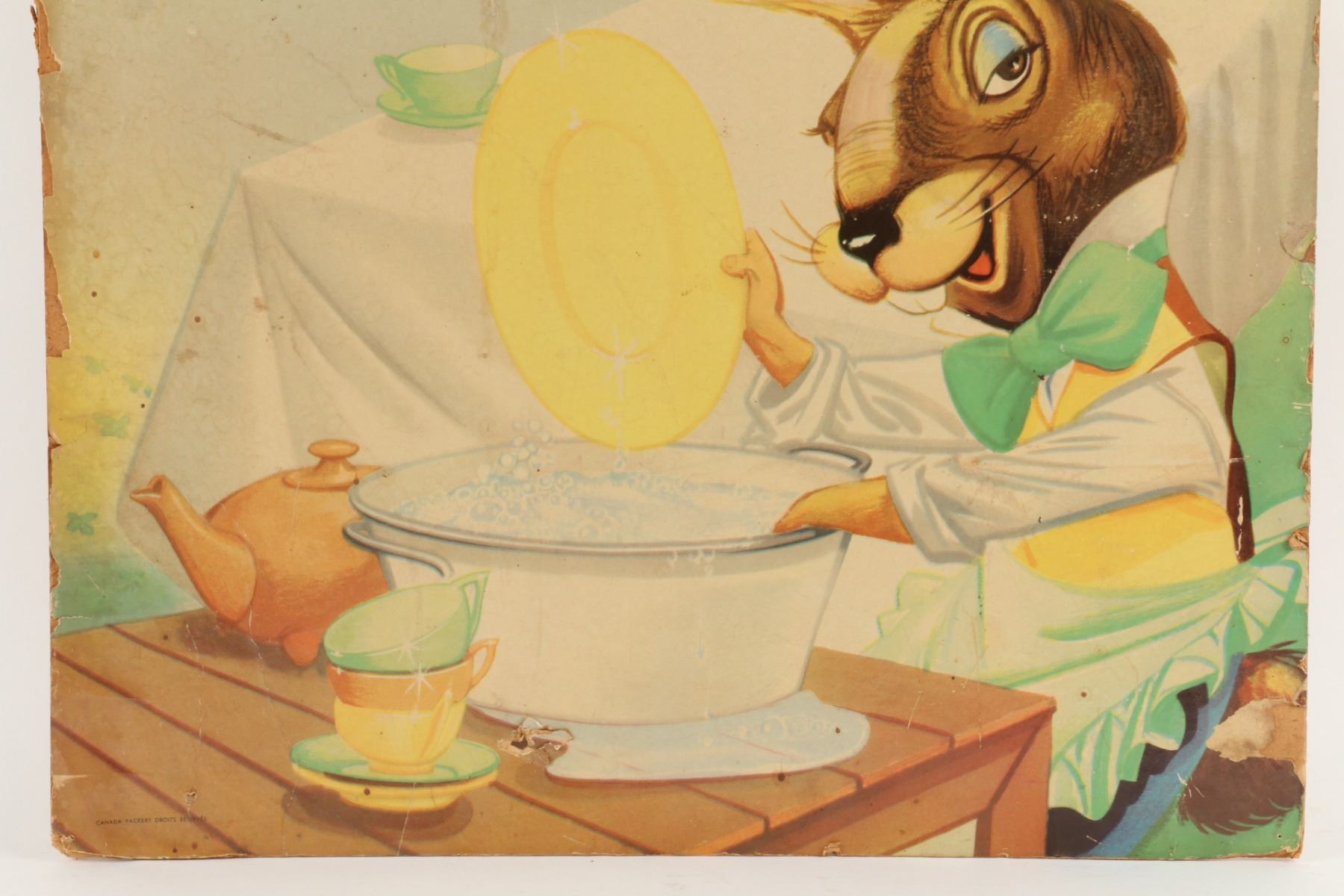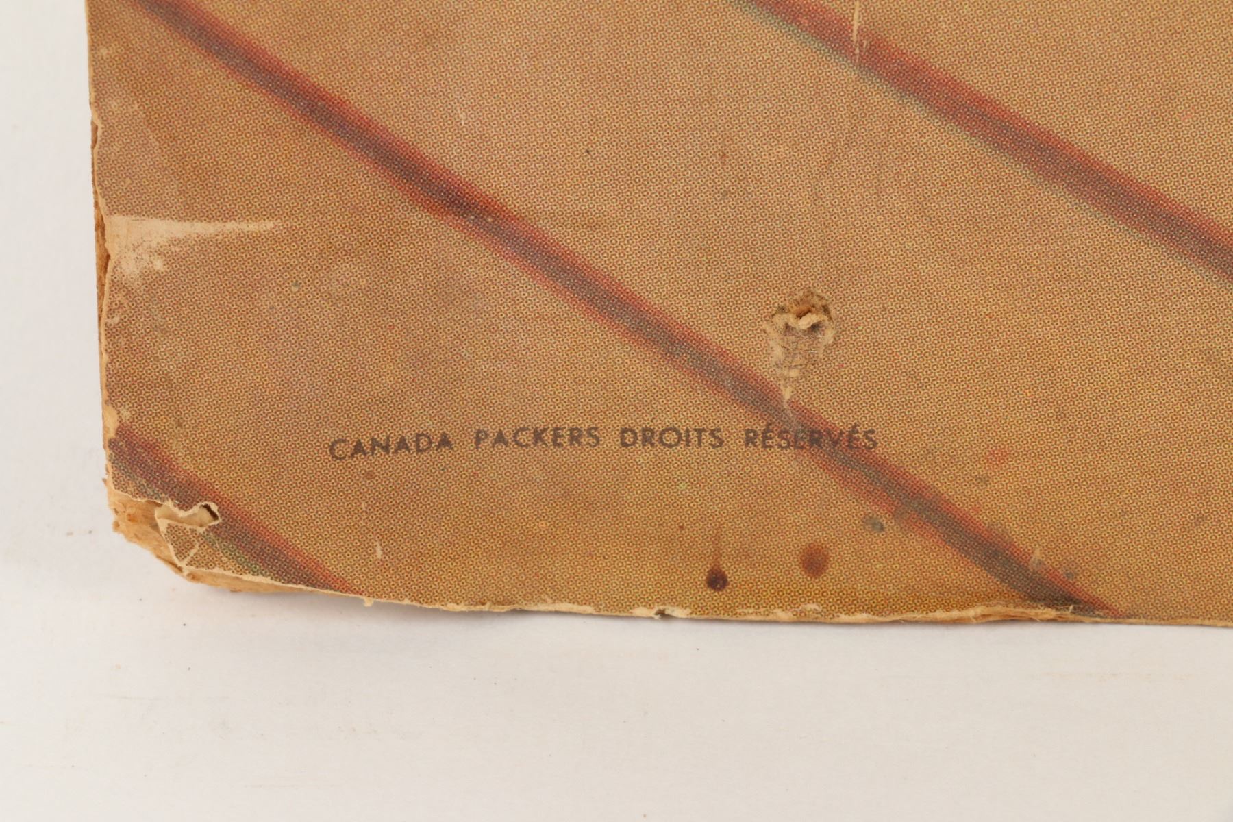 Marked, "Canada Packers Droits Reserves" lower left. 26.5" x 19". Paper separated from backing with creases. Generalized soil. Mounting perforations and significant edge wear. $100-200.
