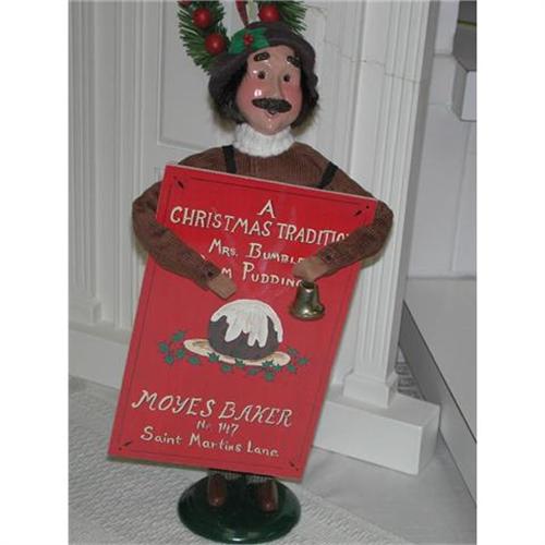 Byers Choice Caroler- The Cries of London Series- Sandwich Board man, Mrs. Bumbles plum pudding, Moyes Baker. This piece was RETIRED in 1996.