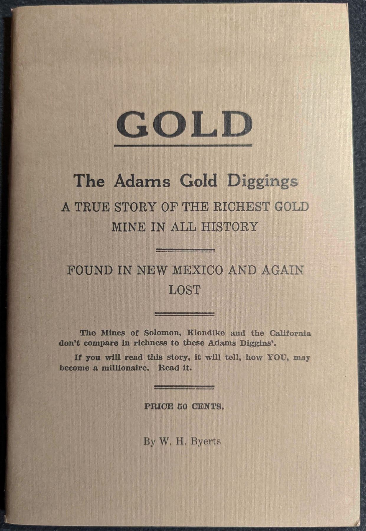 Byerts, W.H. GOLD. THE ADAMS GOLD DIGGINGS. Frederick F. Hollister. 1988. 12mo. 46, (2) pages. San Francisco. facsimile reprint of the excessively rare 1919 first (and only) edition. original brown printed card covers. references. Fine. This book is the story of one of the richest gold mines in all history. Found in New Mexico and again lost. Used extensively in Dobie's 'Apache Gold'. Lot weight: 0 lbs 3oz. Subject(s): Buried Treasure, Lost Mines.