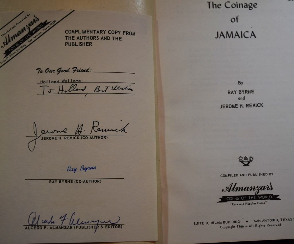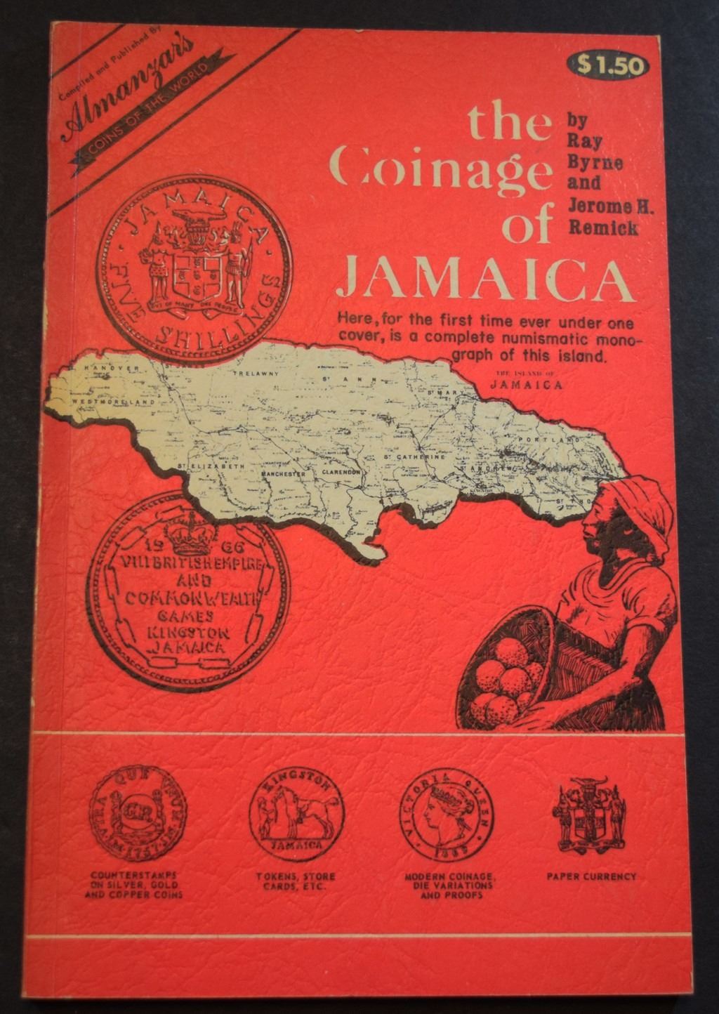 Byrne, Ray & Jerome H. Remick. THE COINAGE OF JAMAICA. Almanzar's Coins of the World. 1966. 12mo. 106 pages. Original pictorial card covers. Fine. b&w plates. Bibliography. Light pencil notations throughout. Complimentary copy card with both authors, and publisher's signatures pasted in. This book was written primarily for the collector seeking the factual knowledge necessary for compiling a collection of Dominican coins, but it also includes information for those who may desire an education in the numismatic history of the Dominican Republic. Topics of this book include: numismatic history, coin grading standards, coinage by dates 1844-1964, pattern coins, die varieties, commemorative coins, and mints. Lot weight: 0 lbs 6oz. Subject(s): Coinage - Jamaica.