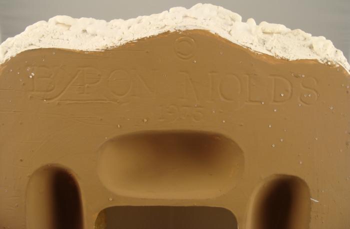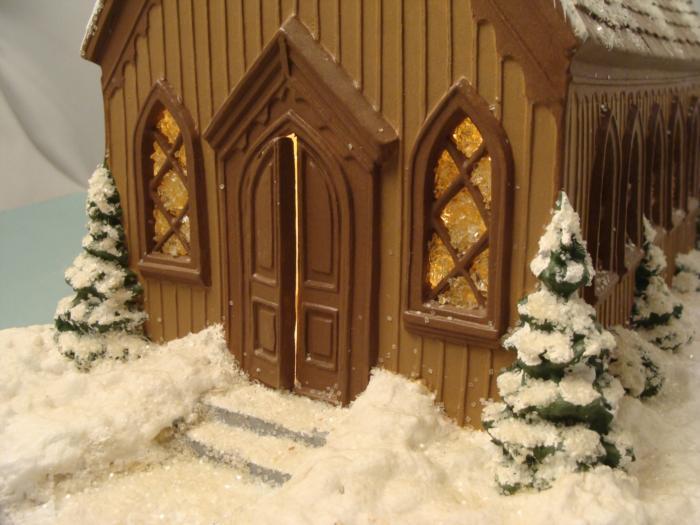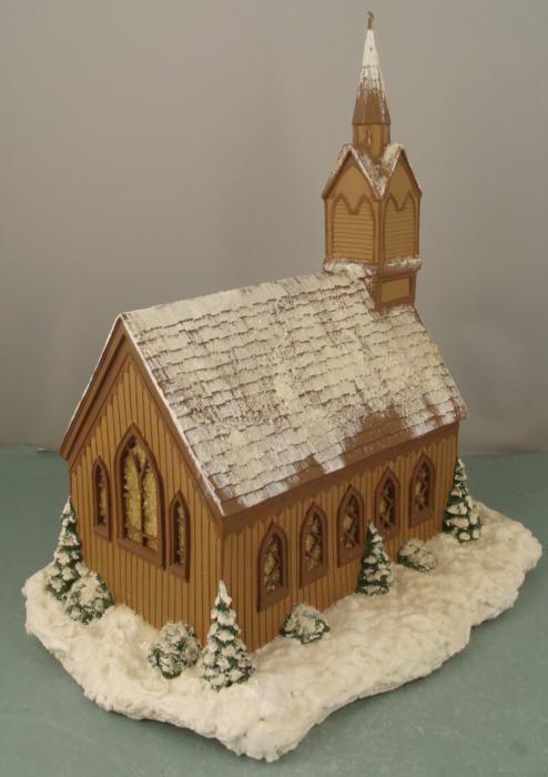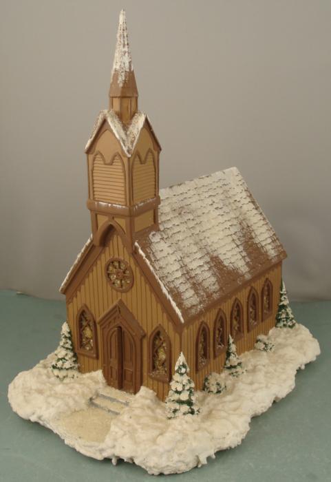This model of a church in winter was made from a Byron Molds casting, dated 1975. It is fully constructed, painted two shades of brown, and sparkling with snow. The size of the base is 10" x 14", and the structure is 9 1/2" x 6" x 15 1/2". Also included is a light for underneath, and it works with a switch.