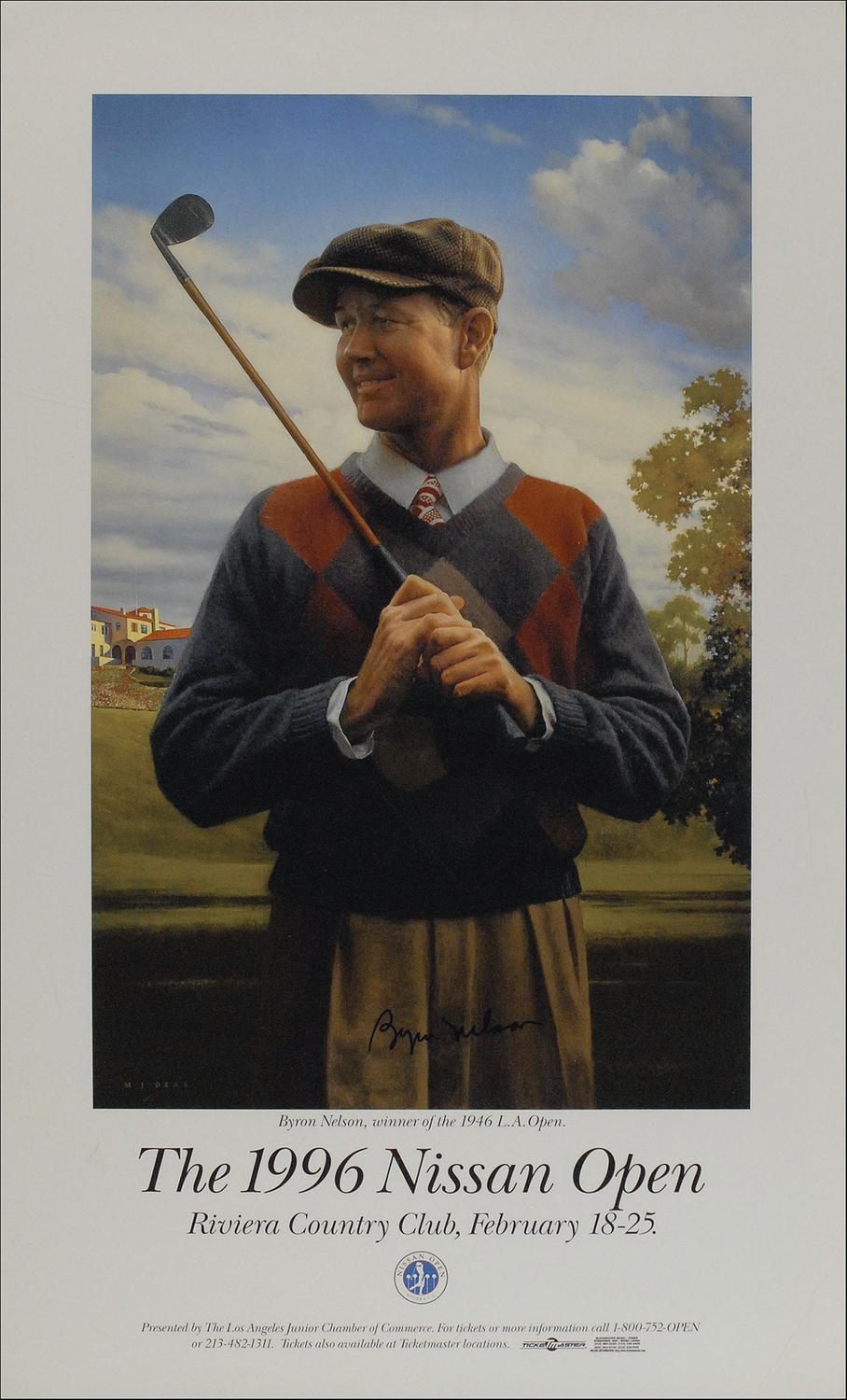 Color 28 x 17 print for the 1996 Nissan Open, featuring an image of Nelson, signed in blue felt tip. Rolled and in fine condition.