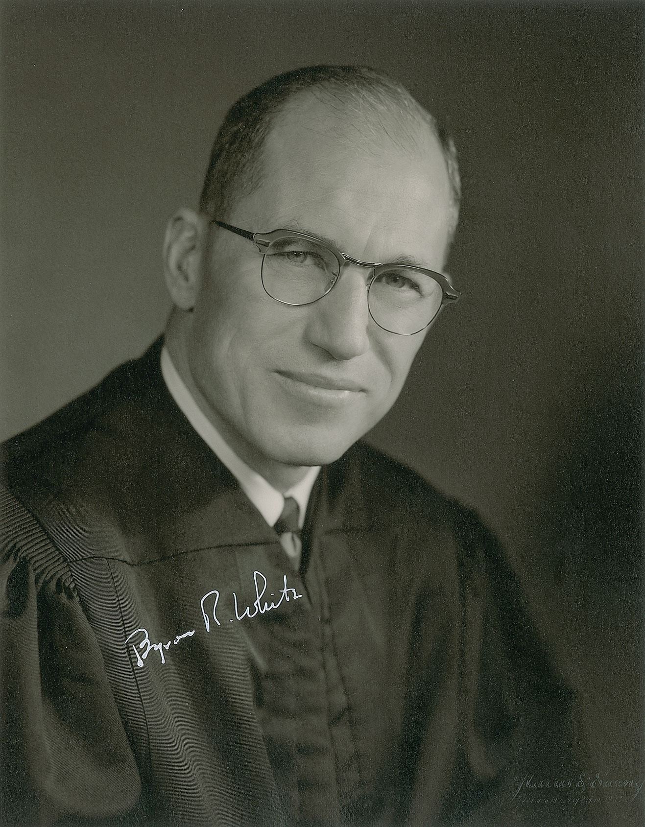 Sharp vintage matte-finish 7.75 x 10 photo of Associate Justice White in his judicial robe by Harris & Ewing, signed in white ink, "Byron R. White." Blindstamped in the lower right corner by the studio, and stamp-dated May 6, 1972 on the reverse. In fine condition, with light edge rippling.