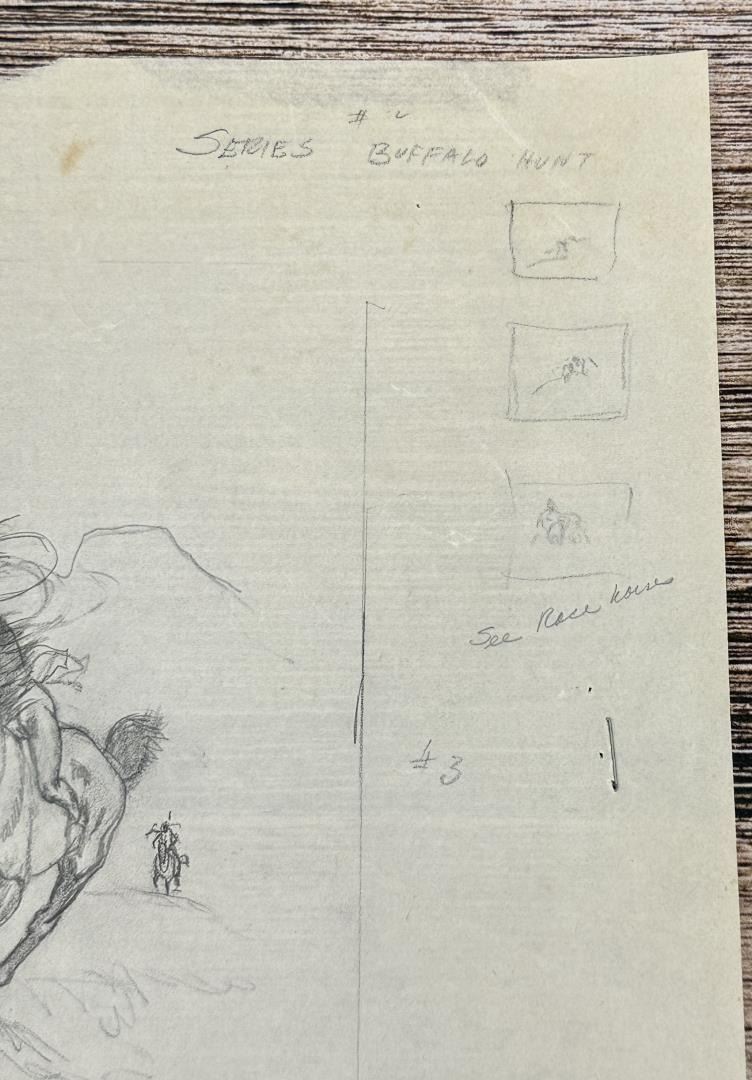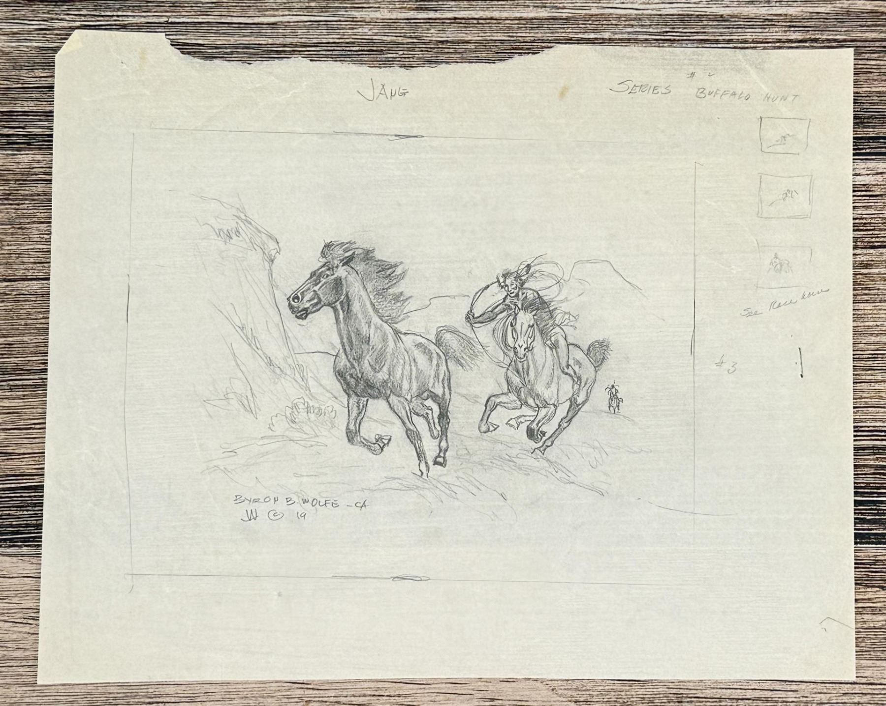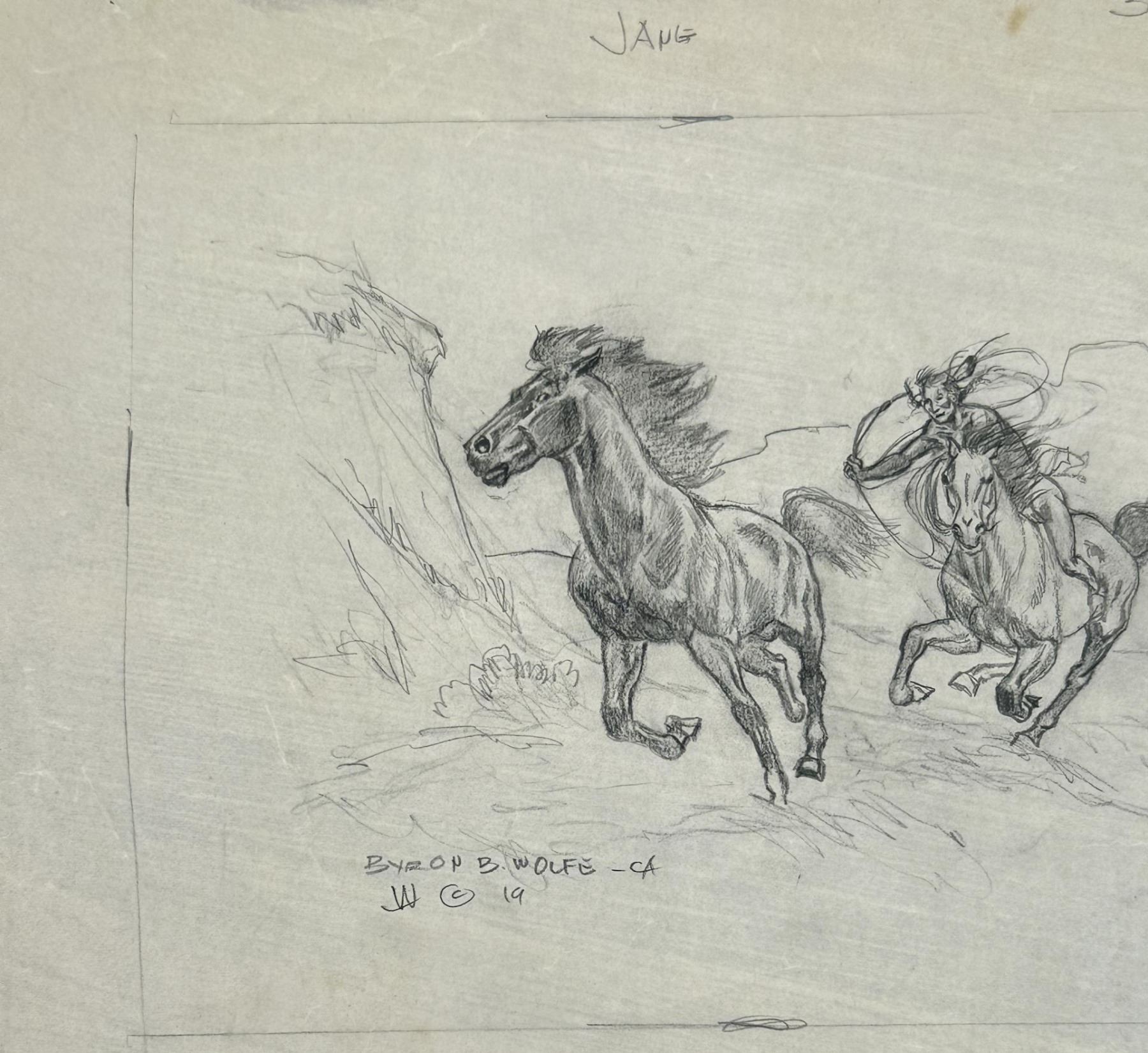 Title is Indian Lassoing a Horse. 10 1/4" by 12 3/4". Graphite on Paper. Byron B. Wolfe (1904 - 1973) was active/lived in Colorado, Kansas. Byron Wolfe is known for Western-Indian genre, illustrator. Born b. Parsons, Apr. 4, 1904; died Monument, CO, May 1973. Painter, spec. cowboys. Illustrator. Worked on a cattle ranch before studying art at University of Kansas, Lawrence. Was associate with J. W. Fazel of Capper Engraving Co., Topeka, 1929. First studio in Kansas City as a commercial artist, specializing in western illustrations for beer ads and newspaper reproductions. Became art director for local ad agency. By 1962 was painting full-time. Living in Leawood when he supplied the watercolor for the cover of the Summer 1969 Kansas Historical Quarterly.
