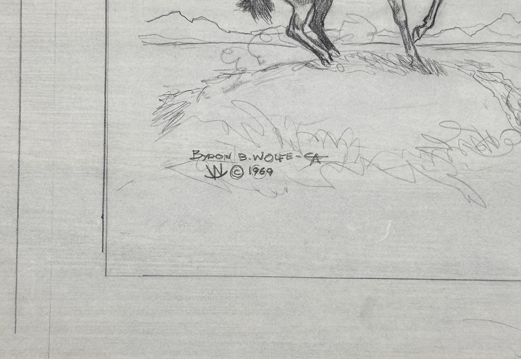 Title is War Signal. 13 1/8" by 16 7/8". Graphite on Paper. Byron B. Wolfe (1904 - 1973) was active/lived in Colorado, Kansas. Byron Wolfe is known for Western-Indian genre, illustrator. Born b. Parsons, Apr. 4, 1904; died Monument, CO, May 1973. Painter, spec. cowboys. Illustrator. Worked on a cattle ranch before studying art at University of Kansas, Lawrence. Was associate with J. W. Fazel of Capper Engraving Co., Topeka, 1929. First studio in Kansas City as a commercial artist, specializing in western illustrations for beer ads and newspaper reproductions. Became art director for local ad agency. By 1962 was painting full-time. Living in Leawood when he supplied the watercolor for the cover of the Summer 1969 Kansas Historical Quarterly.