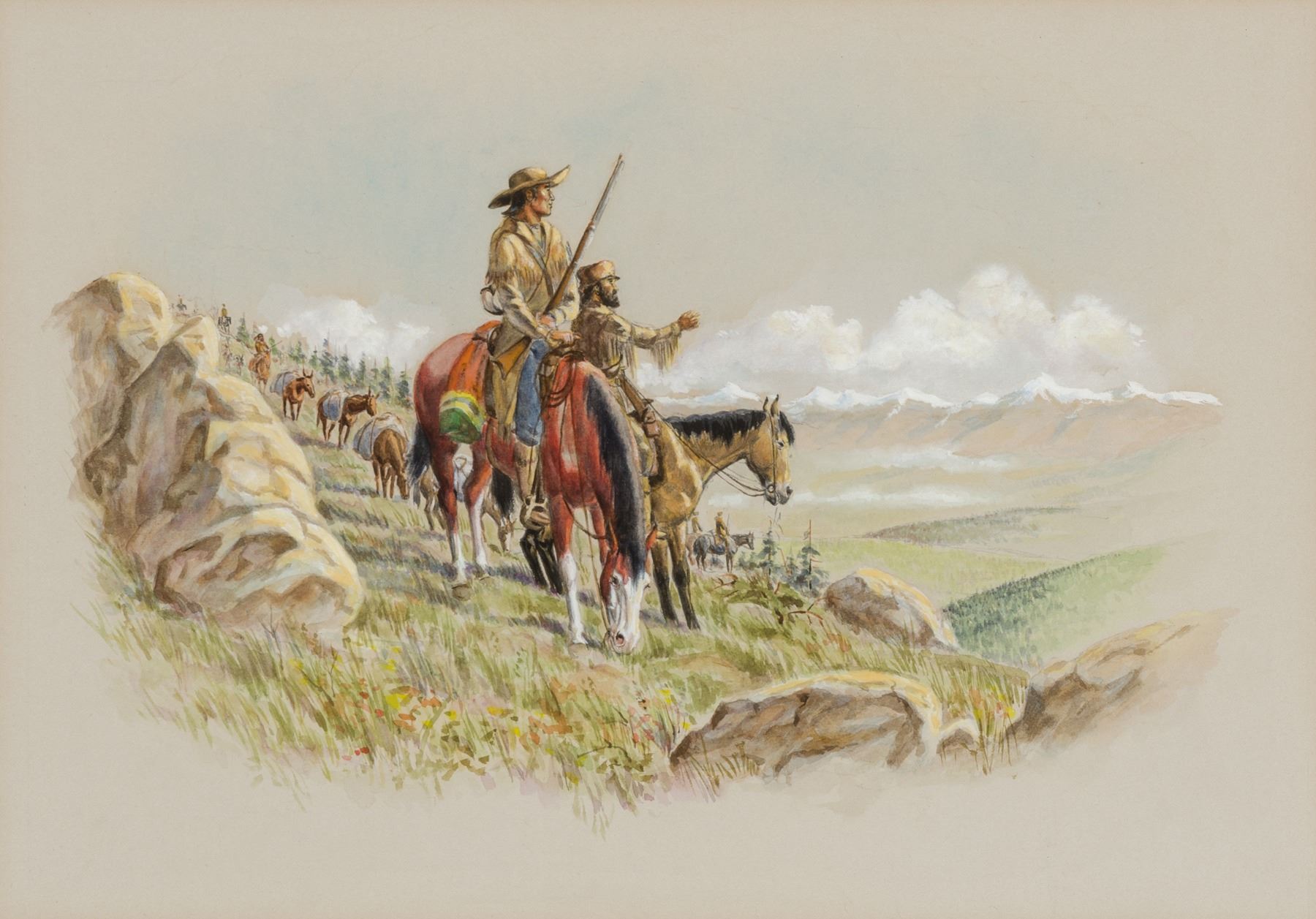 Condition details: This piece is in very good condition. With the unaided eye, there are no issues. Closer inspection under ultraviolet light reveals no issues and no signs of restoration. The work is mounted under glass and has not been inspected out of the frame. The piece is framed in a brown frame with a cream linen liner, gold fillet, and a cream matting. The matting is signed; ‘Kit Carson and Captain Young – Sierras, 1830’ From the Sketch Book of Byron B. Wolfe. The frame is in very good condition with normal wear. The artist’s bio is provided on the back. Verso on the back of the piece: KIT CARSON AND CAPTIAN YOUNG – SIERRAS 1830. TIME-1830. PLACE -SIERRA NEVADA MOUNTAINS – CALIFORNIA. NOTE – Kit Carson and captain Young on a fur trapping venture into the California area. This was a very successful trip. The fur later sold for $24,000. Kit at this time was only 21. Basil Lajeunesse was Kits trapping partner. The experience later helped Kit Carson form his own group who became known as the Famous Carson Men of the fur trade. REF. KIT CARSON AND THE WILD FRONTIER by Ralph Moody, CALIFORNIA by Mebel R. Gillis