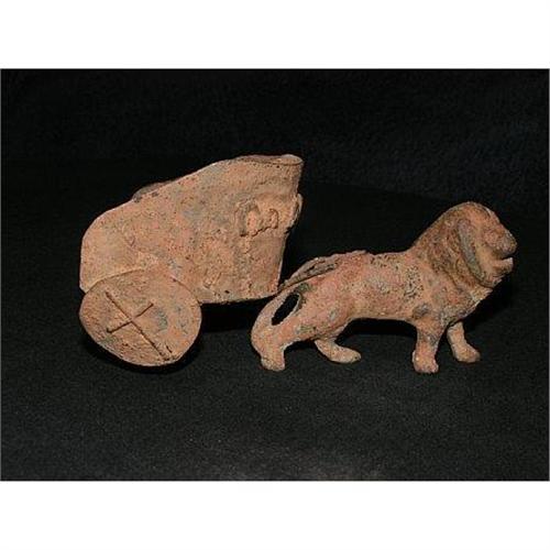 An exteremly rare "Byzantine Bronze Carraige" Pulled by a Lion. The wheel is engraved with the cross. The carriage has Byzantian writing. Bronze reacts with moisture (oxidation) to form a greenish layer on its surface, called patina. L.12cm