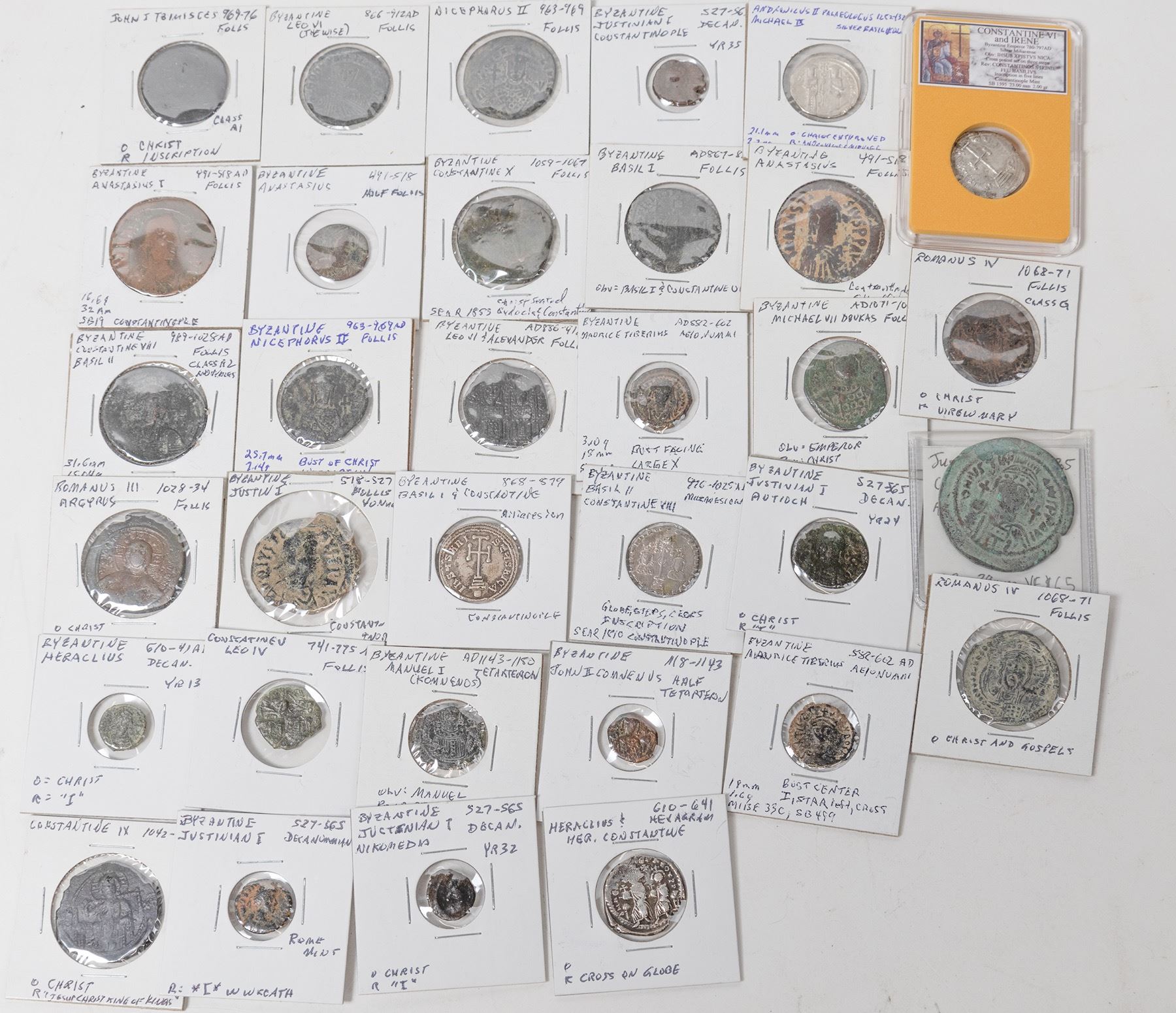 Nice assortment of 32 Byzantine coins from Anastasius (491 AD) to Andronicus II (1328 AD). Many different emperors, 17 folli and 11 minors. All identified , fine or better. A nice range of denominations.