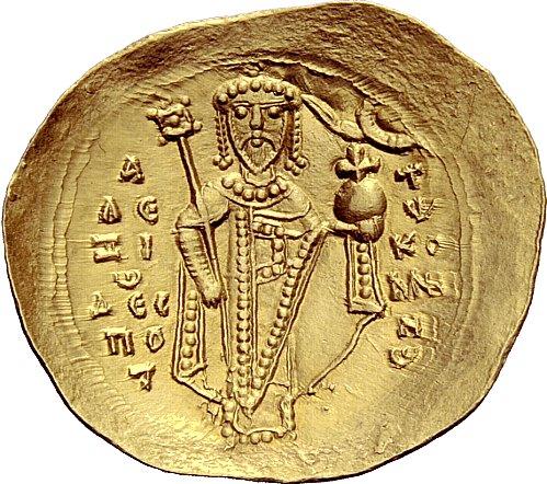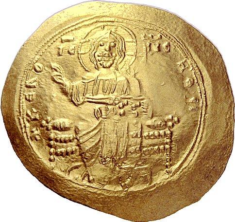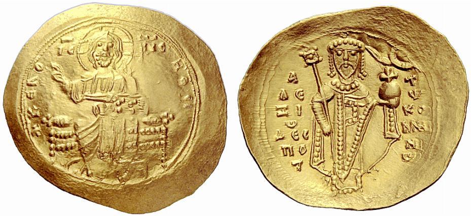The Byzantine Empire, Alexius I Comnenus and colleagues, 1081 – 1118, Post reform coinage, 1092-1118. Hyperpyron, Thessalonica 1092-1118, AV 4.40 g. KE RO - HQEI Christ seated facing on throne with crossed nimbus, raising r. hand in blessing and holding Book of Gospels in l.; in field, IC – XC. Rev. ALEXIW DECPOT - TW KOMNHNW Emperor, wearing crown and chlamys, standing facing and holding labarum and globus cruciger, crowned above by the hand of God. DO 4var. Sear 1924. Good extremely fine