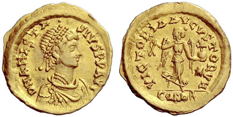 The Byzantine Empire, Anastasius I, 491 – 518, Tremissis 491-518, AV 1.41 g. D N ANASTA – SIVS P P AVG Pearl-diademed, draped and cuirassed bust r. Rev. VICTORIA AVGVSTORVM Victory advancing r., head l., holding wreath and globus cruciger. DO 10a. MIBE 11. Sear 8. About extremely fine / extremely fine