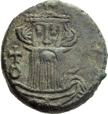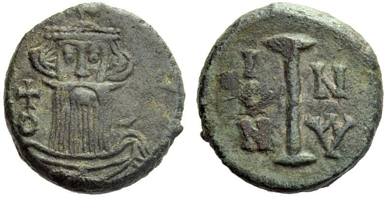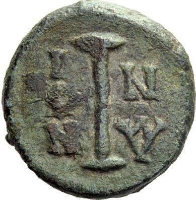 The Byzantine Empire. Constans II 641 – 668, with colleagues from 654. Decanummium, Catana year 10 / 650-651, Æ 3.78 g. Bust facing, with long beard, wearing crown with cross on circlet and chlamys, holding globus cruciger in r. hand. Rev. Large I between A / N – N / O / I. DO 185. MIB 214. Sear 1115. Spahr 121. Green patina and good very fine