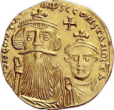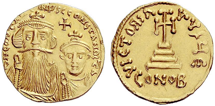 The Byzantine Empire. Constans II 641 – 668, with colleagues from 654. Solidus circa 654-659, AV 4.46 g. dN CONStANtINYS CCONStANOStA Facing busts of Constans, with long beard, on l., and Constantine IV, on r., each wearing crown surmounted by cross on circlet and chlamys; in field above, between them, cross. Rev. VICTO’IA – AVGYE Cross potent on four steps; in exergue, CONOB. DO cf. 25e. MIB 26. Sear 959. Extremely fine