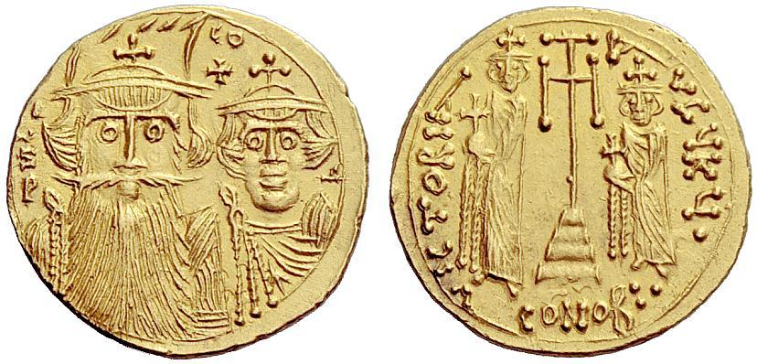 The Byzantine Empire. Constans II 641 – 668, with colleagues from 654. Solidus, Syracuse circa 661-668, AV 4.34 g. d N CO – CO – Y Facing busts of Constans, with long beard, on l., wearing plumed helmet with cross and chlamys, and Constantine IV, on r., wearing crown with cross on circlet and chlamys; in field above, between them, cross. Rev. VICTORIA – AVGYKY· Cross potent on four steps between Heraclius and Tiberius standing facing; in exergue, CONOB:· . DO 162d. MIB 96. Sear 1086. Spahr 151. Very rare and in exceptional condition for the issue. Good extremely fine