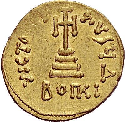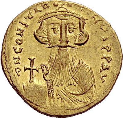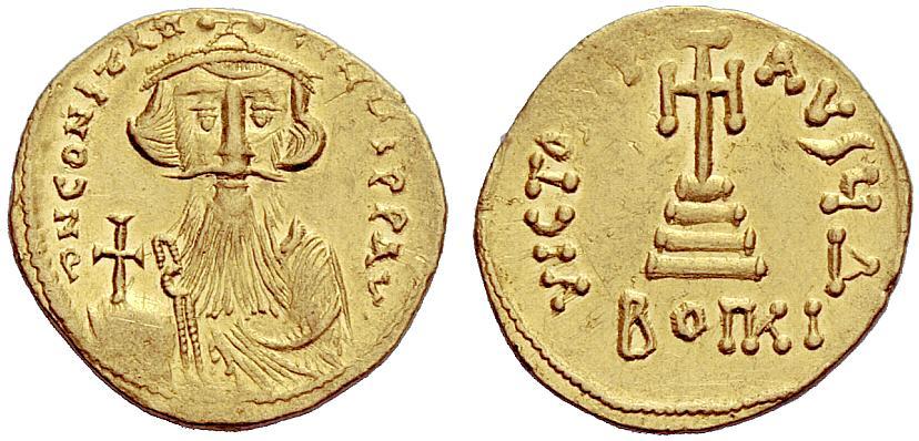 The Byzantine Empire. Constans II 641 – 668, with colleagues from 654. Solidus of 23 siliquae 651-654, AV 4.29 g. d N CONStAN – TINYS PP AV Bust facing, with long beard, wearing crown with cross on circlet and chlamys, holding globus cruciger in r. hand. VICTORIA – AVSYD Cross potent on four steps; in exergue, BOPKI. DO –. MIB 45. Sear 980. A rare variety. Light marks on reverse, otherwise extremely fine