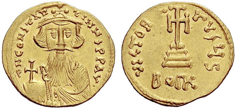 The Byzantine Empire. Constans II 641 – 668, with colleagues from 654. Solidus of 23 siliquae 651-654, AV 4.31 g. d N CONStAN – TINYS PP AV Bust facing, with long beard, wearing crown with cross on circlet and chlamys, holding globus cruciger in r. hand. Rev. VICTORIA – AVGYS Cross potent on four steps; in exergue, BOPK. DO 24c. MIB 44. Sear 979. Good extremely fine