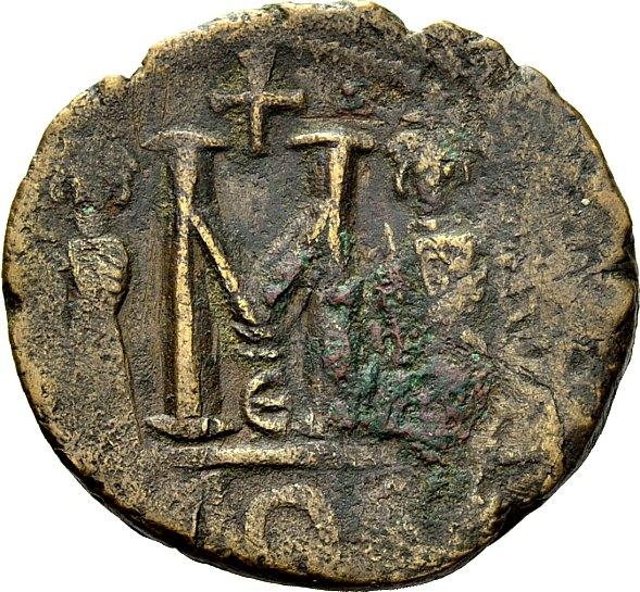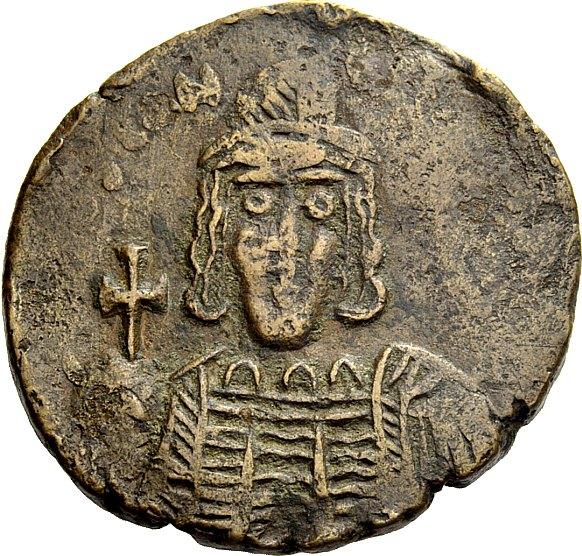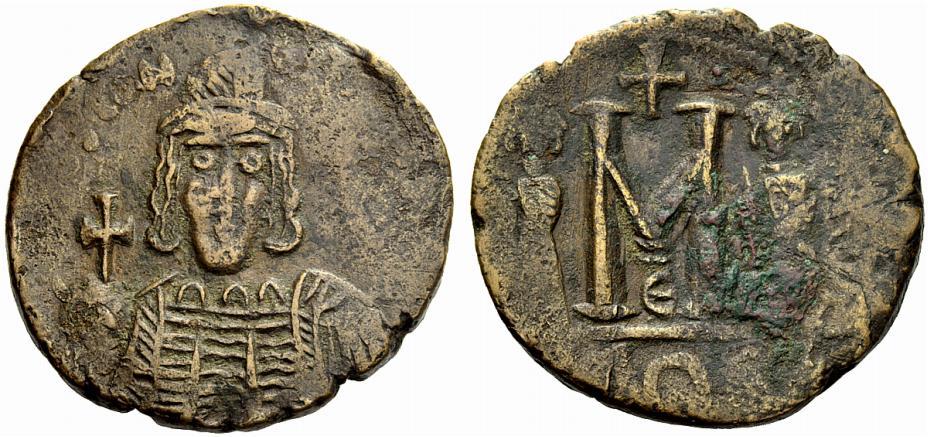 The Byzantine Empire, Constantine IV, Pogonatus, 668 – 685, and associate rulers Heraclius and Tiberius, Augusti until 681, Follis 669-673, Æ 17.22 g. [d N CONSTAN – TIN P P AY] Helmeted and cuirassed bust facing, holding globus cruciger and shield with horseman and enemy motif. Rev. Large M between the facing and standing figures or Heraclius and Tiberius; above, cross and below, E. In exergue, CON. DO 28. MIB 77. Sear 1173. Very rare. Brown tone, areas of weakness, otherwise very fine