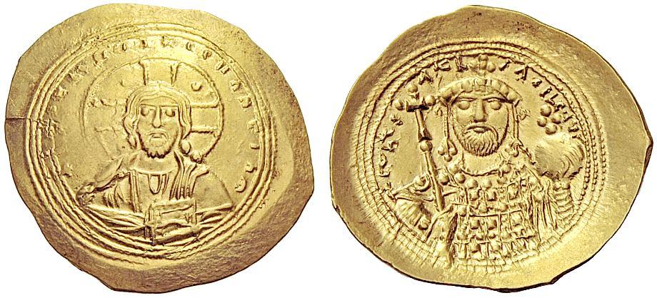 The Byzantine Empire. Constantine IX Monomachus, 1042 – 1055. Histamenon nomisma 1042-1055, AV 4.40 g. +IHS XIS REX – REGNANTIYM Bust of Christ facing, with crossed nimbus, raising r. hand in blessing and holding Book of Gospels; triple border. Rev. + C&hSTA – hTh – bASILEYS RM Bust facing, wearing crown and loros, holding cross-tipped sceptre and globus cruciger surmounted by pelleted cross; triple border. DO 3. Sear 1830. Good extremely fine. Ex DNW sale 9, 2008, 478.