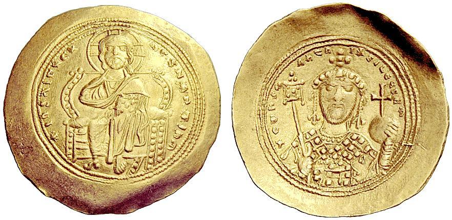 The Byzantine Empire. Constantine IX Monomachus, 1042 – 1055. Histamenon nomisma 1042-1055, AV 4.41 g. + IHS XIS REX – REGNANTIYM Christ enthroned facing with crossed nimbus, raising r. hand in blessing and holding Book of Gospels in l.; triple border. Rev. + C&hSTA – hTh – bASILEYS RM Bust facing, wearing crown and loros, holding labarum and globus cruciger; triple border. DO 2a. Sear 1829. Good very fine. Ex Auctiones sale 15, 1985, 864.