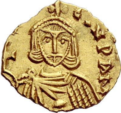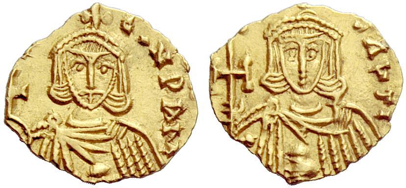 The Byzantine Empire. Constantine V Copronymus, 741 – 775, with Leo IV from 751. Tremissis, Syracuse 751-775, AV 1.21 g. […] – CON PAM Bust of bearded Constantine V facing, wearing crown and chlamys, holding globus cruciger. Rev. […] – […]ANtC Bust of Leo IV facing, wearing crown with cross on circlet and chlamys, holding cross potent on base. DO 17. Sear 1567. Spar 330. Irregular flan, otherwise extremely fine