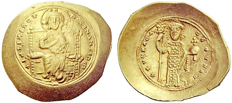 The Byzantine Empire. Constantine X Ducas, 1059 – 1067. Histamenon nomisma 1059-1067, AV 4.42 g. + IHS XIS RCX – REGNANTIYM Christ enthroned facing with crossed nimbus, raising r. hand in blessing and holding Book of Gospels in l.; triple border. Rev. + K&N RACL – O DOVKAC Emperor standing facing, wearing crown and loros, holding labarum with pellet on shaft and globus cruciger, pearl-shaped object suspended from l. hand; triple border. DO 1b. Sear 1847 Light reddish tone, virtually as struck and almost Fdc. Ex Giessener Münzhandlung sale 92, 1998, 691.