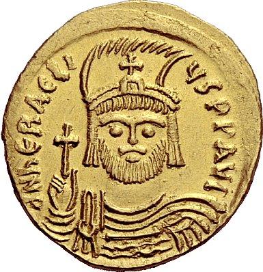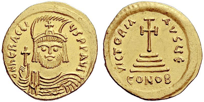 The Byzantine Empire. Heraclius, 610 – 641, with colleagues from 613. Solidus 610-613, AV 4.46 g. d N HERACLI – YS PP AVC Cuirassed bust facing, wearing crowned plumed helmet with cross on circlet and paludamentum, holding globus cruciger in r. hand. Rev. VICTORIA – AVGYE Cross potent on four steps; in exergue, CONOB. DO 3b. MIB 5. Sear 731. Minor marks on reverse, otherwise good extremely fine. Ex NGSA sale II, 2002, 171.