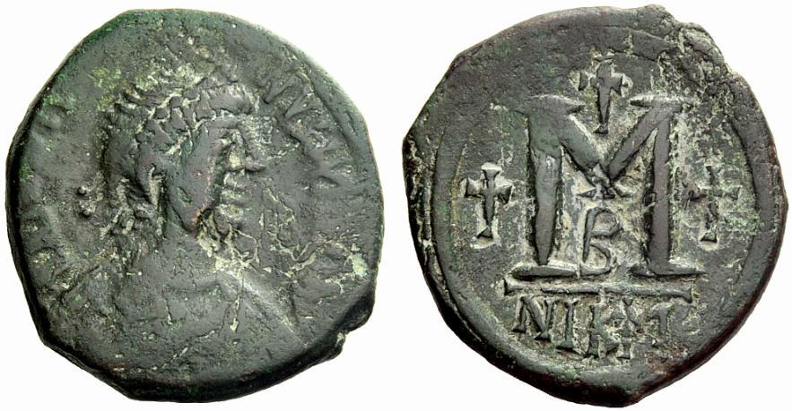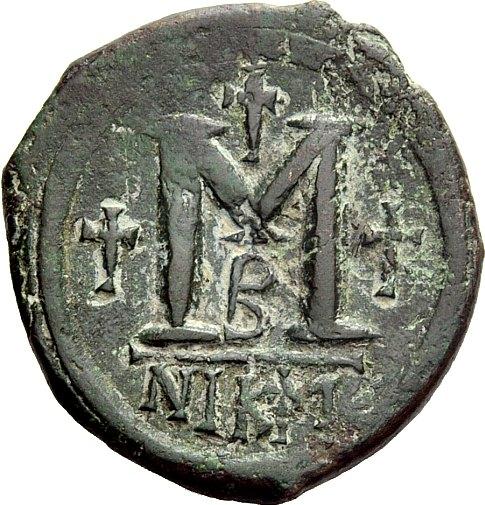 The Byzantine Empire, Justin I and Justinian I, 4th April – 1st August 527, Follis, Nicomedia 527, Æ 15.50 g. DN IV[STI – ]NVS IVS… Pearl-diademed, draped and cuirassed bust r. Rev. Large M flanked and surmounted by cross; beneath, B and in exergue NIKM. DO –. MIBE 8. Sear 128. Rare. Green patina and very fine