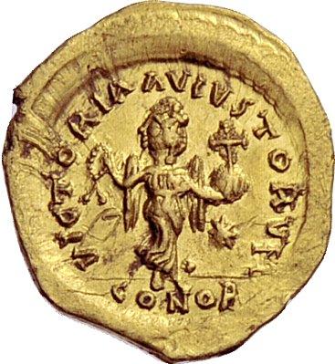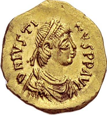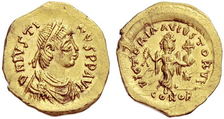 The Byzantine Empire. Justin I, 518 – 527. Tremissis 518-527, AV 1.49 g. D N IVSTI – NVS PP AVG Diademed, draped and cuirassed bust r. Rev. VICTORIA AVGVSTORVM Victory walking r., head l., holding wreath and globus cruciger; in r. field, star. In exergue, CONOB. DO 4. MIBE 5. Sear 58. A minor mark on cheek, otherwise extremely fine. Ex Lanz sale 125, 2005, 1193.