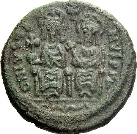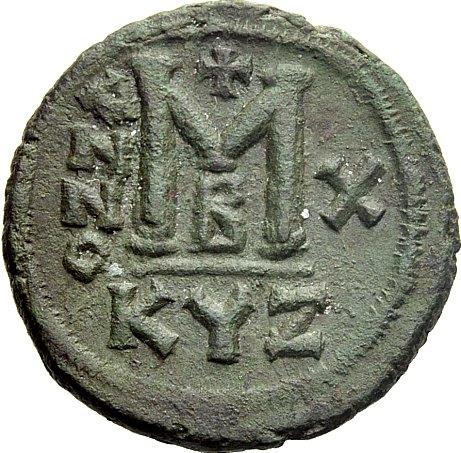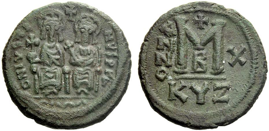 The Byzantine Empire. Justin II, 565 – 578. Follis, Cyzicus year X / 574-5, Æ 13.32 g. D N IVSTI – NVS PP A Justin and his wife Sophia, both nimbate, seated facing on throne: the Emperor holds the globus cruciger, Sophia a cruciform sceptre; between their heads, a cross. In exergue, a wavy pattern. Rev. Large M between A / N / N / O – X; above, cross and beneath, B. In exergue, KYZ. DO 123c.var (star). MIBE 50b.2. Sear 372. Green patina, good very fine / about extremely fine