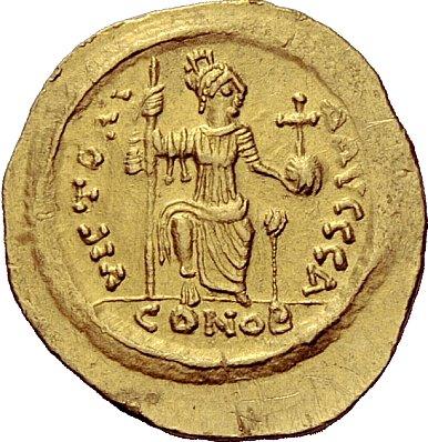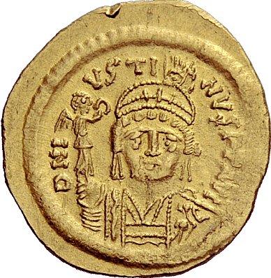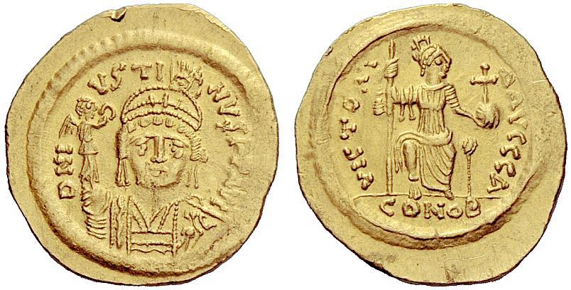 The Byzantine Empire. Justin II, 565 – 578. Solidus 565-578, AV 4.50 g. D N – IVSTI – NVS PP AVG Helmeted, diademed and cuirassed bust facing, holding Victory on globe and shield decorated with horseman and enemy motif. Rev. VICTORI – A AVGGG A Constantinopolis seated facing, head r., holding spear and globus cruciger; in exergue, CONOB. DO 4a. MIBE 5. Sear 345. Minor nick on edge at eleven o'clock on obverse, otherwise good very fine