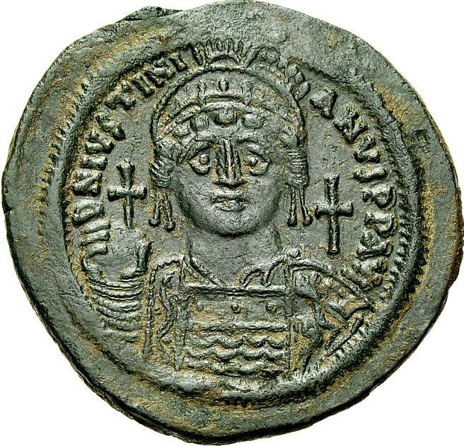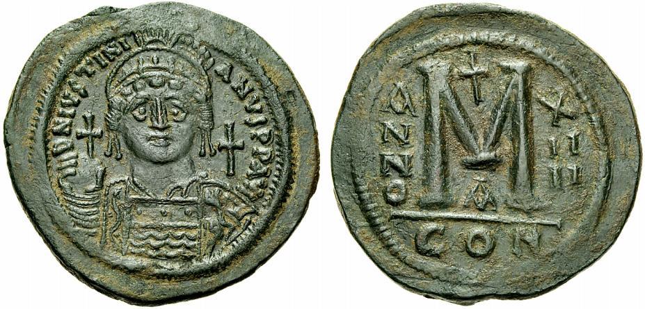 The Byzantine Empire. Justinian I, 527 – 565. Follis year 14 / 540-1, Æ 22.21 g. D N IVSTINI – ANVS P F AVG Helmeted, diademed and cuirassed bust facing, holding globus cruciger and shield decorated with horseman and enemy motif; in r. field, cross. Rev. Large M between A / N / N / O – X / II / II; above, cross and beneath, A. In exergue, CON. DO 39a. MIBE 95a. Sear 163. Extremely fine. Ex CNG 36, 1995, 2516 and Triton VIII, 2005, 1305 sales. From the Malcom W. Heckman collection.