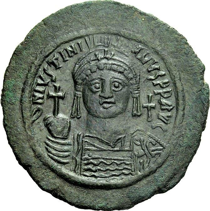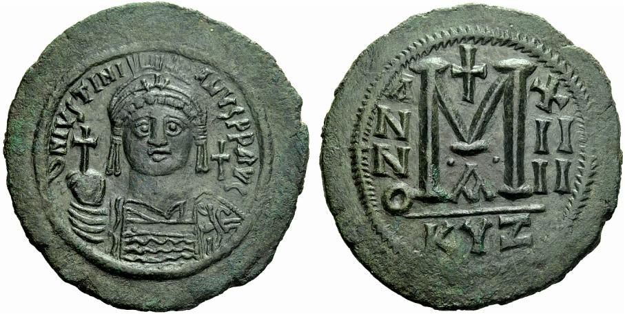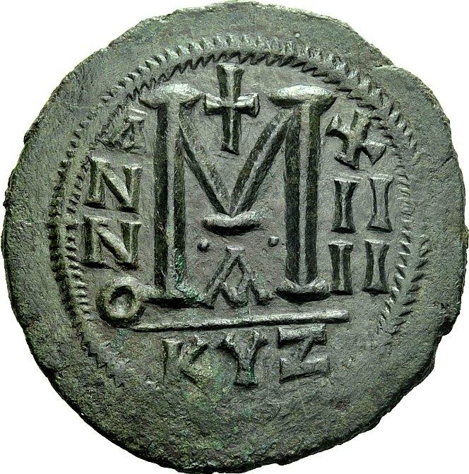 The Byzantine Empire. Justinian I, 527 – 565. Follis, Cyzicus year 14 / 540-1, Æ 22.67 g. D N IVSTINI – ANVS P F AVG Helmeted, diademed and cuirassed bust facing, holding globus cruciger and shield decorated with horseman and enemy motif; in r. field, cross. Rev. Large M between A / N / N / O – X / II / II; above, cross and beneath, A. In exergue, KYZ. DO 166a.1. MIBE 120b. Sear 207. Struck on a very broad flan with a lovely dark green patina, extremely fine