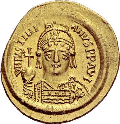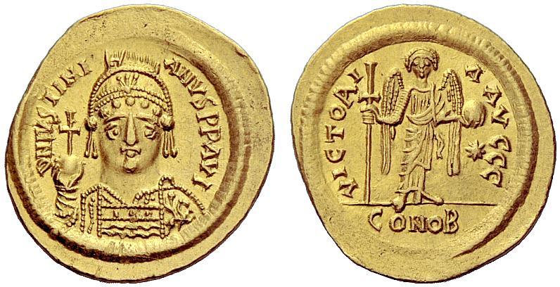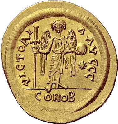 The Byzantine Empire, Justinian I, 527 – 565, Solidus 538-545, AV 4.37 g. D N IVSTINI – ANVS P P AVC Helmeted, pearl-diademed and cuirassed bust facing r., holding globus cruciger and shield with horseman and enemy motif. Rev. VICTORI – A AVGGG Angel standing facing, holding long cross and globus cruciger; in r. field, star. In exergue, CONOB. DO 7. MIB 22. Sear 138. Extremely fine