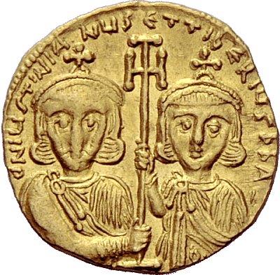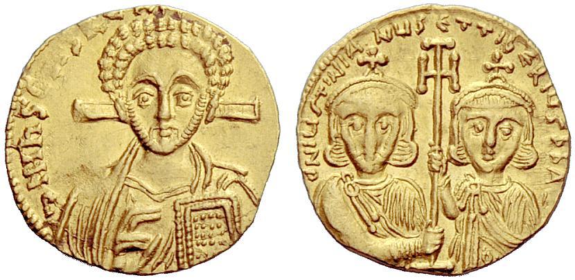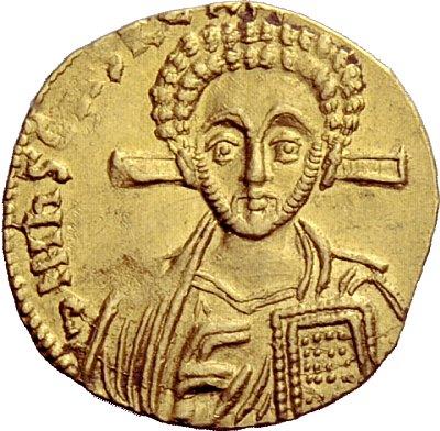 The Byzantine Empire. Justinian II, second reign 705 – 711, with Tiberius. Tremissis 705-711, AV 1.42 g. dN hIS ChS REX – [REGNANTIYM] Bust of Christ facing with cross behind head and close beard, raising r. hand in blessing and holding Book of Gospels in l. Rev. d N IYSTINIAN – YS ET TIbERIYS P P A – Half-length figures of Justinian II, on l., and Tiberius, on r., facing, each wearing crown, divitision and chlamys and holding between them cross potent. DO 6a. MIB 6a. Sear 1420. Extremely fine