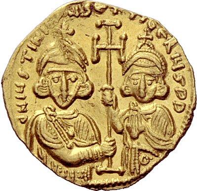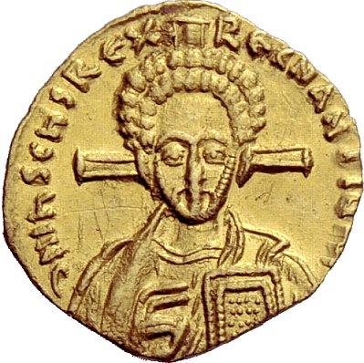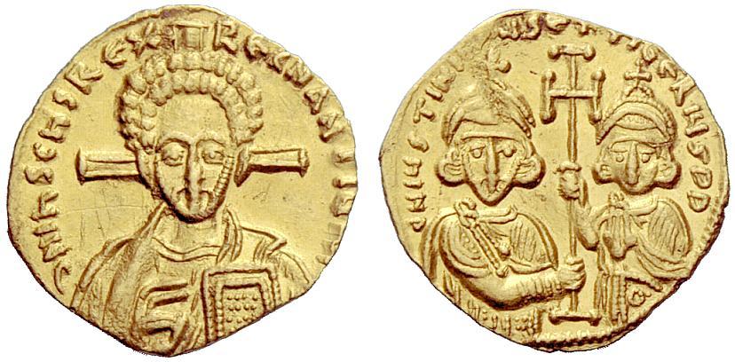 The Byzantine Empire. Justinian II, second reign 705 – 711, with Tiberius. Tremissis 705-711, AV 1.42 g. dN hIS ChS REX – [REGNANTIYM] Bust of Christ facing with cross behind head and close beard, raising r. hand in blessing and holding book of Gospels in l. Rev. d N IYSTINIAN – YS ET TIbERIYS P P A – Half-length figures of Justinian II, on l., and Tiberius, on r., facing, each wearing crown, divitision and chlamys and holding between them cross potent on base. DO 6b. MIB 6b. Sear 1421. Minor marks on obverse, otherwise good extremely fine