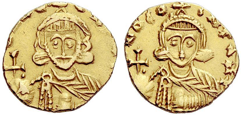The Byzantine Empire. Leo III the Isaurian, 717 – 741, with colleagues from 720. Solidus, Syracuse 720-735, AV 3.89 g. [dND LEO] – [P A M] Bust of Leo facing, with close beard, wearing crown with cross on circlet and chlamys, holding globus cruciger with dot at base of cross and akakia. Rev. […] DOCO – SNTANT Facing bust of youthful Constantine, wearing crown with cross on circlet and chlamys, holding globus cruciger with dot at base of cross and akakia. DO 43 var. (no dot at base of cross). Sear 1537B (uncertain Italian mints). Spahr 299 (this coin). Very rare. Very fine. Ex Leu-M&M sale 11 March 1987, Spahr, 37.