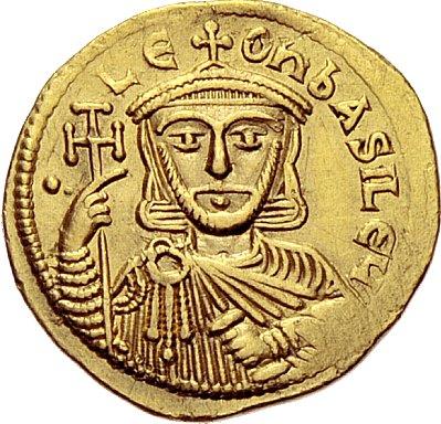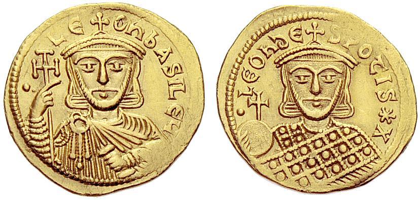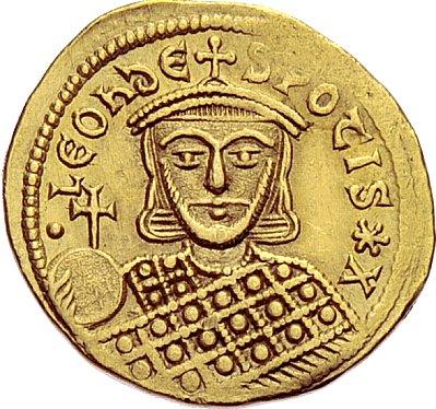 The Byzantine Empire. Leo V the Armenian, 813 – 820, with Constantine from December 813. Solidus 813, AV 4.46 g. · – LE – O§ bASILEY' Facing bust, with short beard, wearing crown with cross and chlamys, holding cross potent on base. Rev. · – LEO§ dE – SPOTISQX Facing bust, with short beard, wearing crown with cross and loros, holding globus cruciger. DO 1. Sear 1626. Füeg 1a. Of the highest rarity, only eight specimens known of which only six are in private hands. Struck on broad flan and well centred, extremely fine. Ex Triton sale XII, 2009, 836.