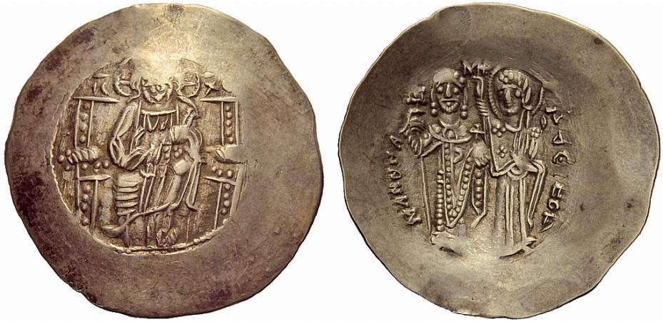 The Byzantine Empire. Manuel I Comnenus, 1143 – 1180. Aspron trachy 1167-1183 (?), EL 4.13 g. Christ, with crossed nimbus, seated upon throne with back, raising r. hand in benediction and holding Book of Gospels in l., on either side of nimbus, IC – XC. Rev. MAN_HL – DECPOT’ The Emperor, on l., wearing divitision and chlamys, and holding labarum, crowned by the Virgin, on r., nimbate, wearing pallium and maphorion; at sides of the head of the Virgin, MHP (ligate) – QV. DO 6c. Sear 1961. Minor weakness on obverse, otherwise extremely fine. Ex H. Berk list 101, 1998, 49.