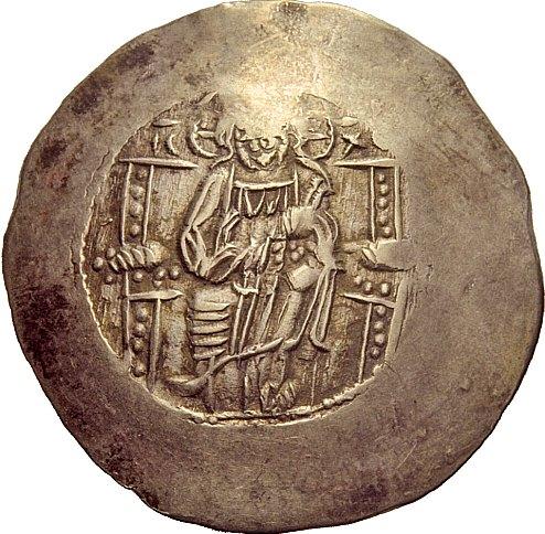 The Byzantine Empire. Manuel I Comnenus, 1143 – 1180. Aspron trachy 1167-1183 (?), EL 4.13 g. Christ, with crossed nimbus, seated upon throne with back, raising r. hand in benediction and holding Book of Gospels in l., on either side of nimbus, IC – XC. Rev. MAN_HL – DECPOT’ The Emperor, on l., wearing divitision and chlamys, and holding labarum, crowned by the Virgin, on r., nimbate, wearing pallium and maphorion; at sides of the head of the Virgin, MHP (ligate) – QV. DO 6c. Sear 1961. Minor weakness on obverse, otherwise extremely fine. Ex H. Berk list 101, 1998, 49.