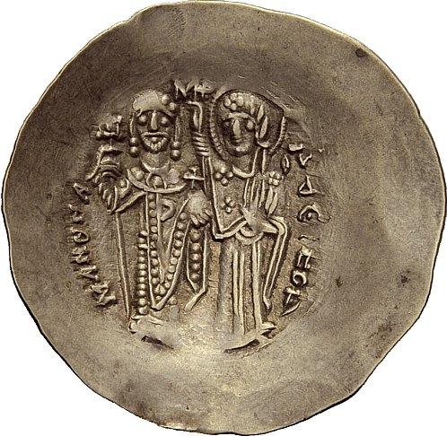 The Byzantine Empire. Manuel I Comnenus, 1143 – 1180. Aspron trachy 1167-1183 (?), EL 4.13 g. Christ, with crossed nimbus, seated upon throne with back, raising r. hand in benediction and holding Book of Gospels in l., on either side of nimbus, IC – XC. Rev. MAN_HL – DECPOT’ The Emperor, on l., wearing divitision and chlamys, and holding labarum, crowned by the Virgin, on r., nimbate, wearing pallium and maphorion; at sides of the head of the Virgin, MHP (ligate) – QV. DO 6c. Sear 1961. Minor weakness on obverse, otherwise extremely fine. Ex H. Berk list 101, 1998, 49.
