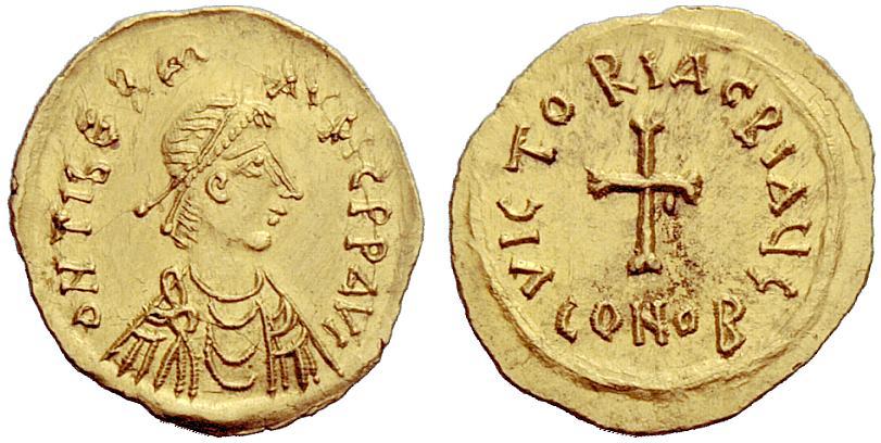 The Byzantine Empire. Maurice Tiberius, 582 – 602. Tremissis, Alexandria 583-602, AV 1.48 g. O N TIbER M – AVRIC PP AVI Diademed, draped and cuirassed bust r. Rev. VICTORIA CRIAYS Cross; beneath, CONOB. DO 16 (Constantinopolis). MIBE 22.1. Sear 503 (Thessalonica). Very rare. Almost invisible traces of double striking on obverse, otherwise extremely fine