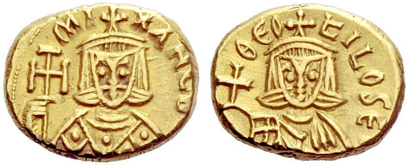The Byzantine Empire. Michael II the Armorian, 820 – 829, with Theophilus from 821 (or 822). Solidus, Syracuse 821-829, AV 3.63 g. MI – XAHLD Bust of Michael facing, wearing crown and loros, holding cross potent. Rev. QEO – FILO SE Bust of beardless Theophilus facing, wearing crown and chlamys and holding globus cruciger. DO 14a.1. Sear 1645. Spahr 385. About extremely fine