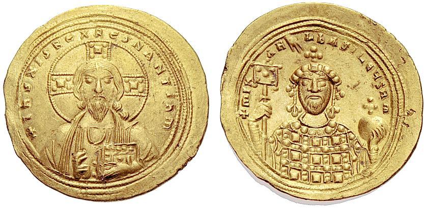 The Byzantine Empire. Michael IV the Paphlagonian, 1034 – 1041. Histamenon nomisma 1034-1041, AV 4.41 g. + IHS XIS REX REGNANTIYM Bust of Christ facing, with ornate crossed nimbus, raising r. hand in blessing and holding Book of Gospels in l. Rev. + MIK – AH – L BASILEYS RM Bust facing, with short beard, wearing crown with cross and loros, holding labarum and globus cruciger; above to l., the hand of God. Triple border. DO 1a. Sear 1824. Extremely fine. Ex Tkalec sale 9 May 2005, 421.