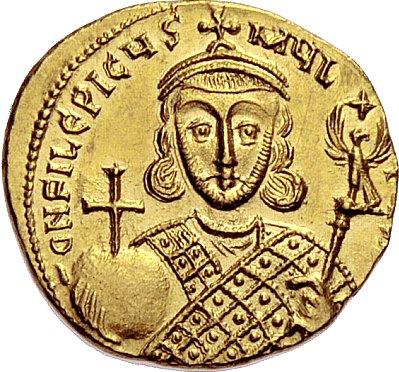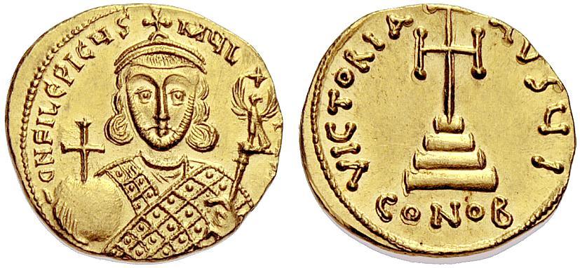 The Byzantine Empire. Philippicus Bardanes, 711 – 713. Solidus 711-713, AV 4.44 g. DN FILEPICYS – MYL [– TYS AN] Bust facing, with close beard, wearing loros and crown with cross, holding globus cruciger in r. hand and eagle-tipped sceptre with cross above in l. Rev. VICTORIA AVGU I Cross potent on four steps; in exergue, CONOB. DO 1j. MIB 1. Sear 1447. Rare. Virtually as struck and almost Fdc. Ex NAC sale 29, 2005, 705.